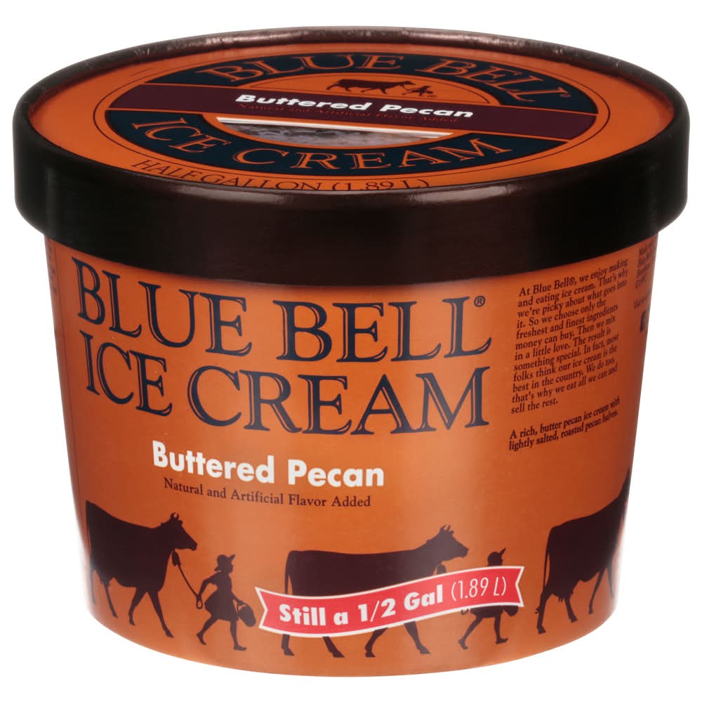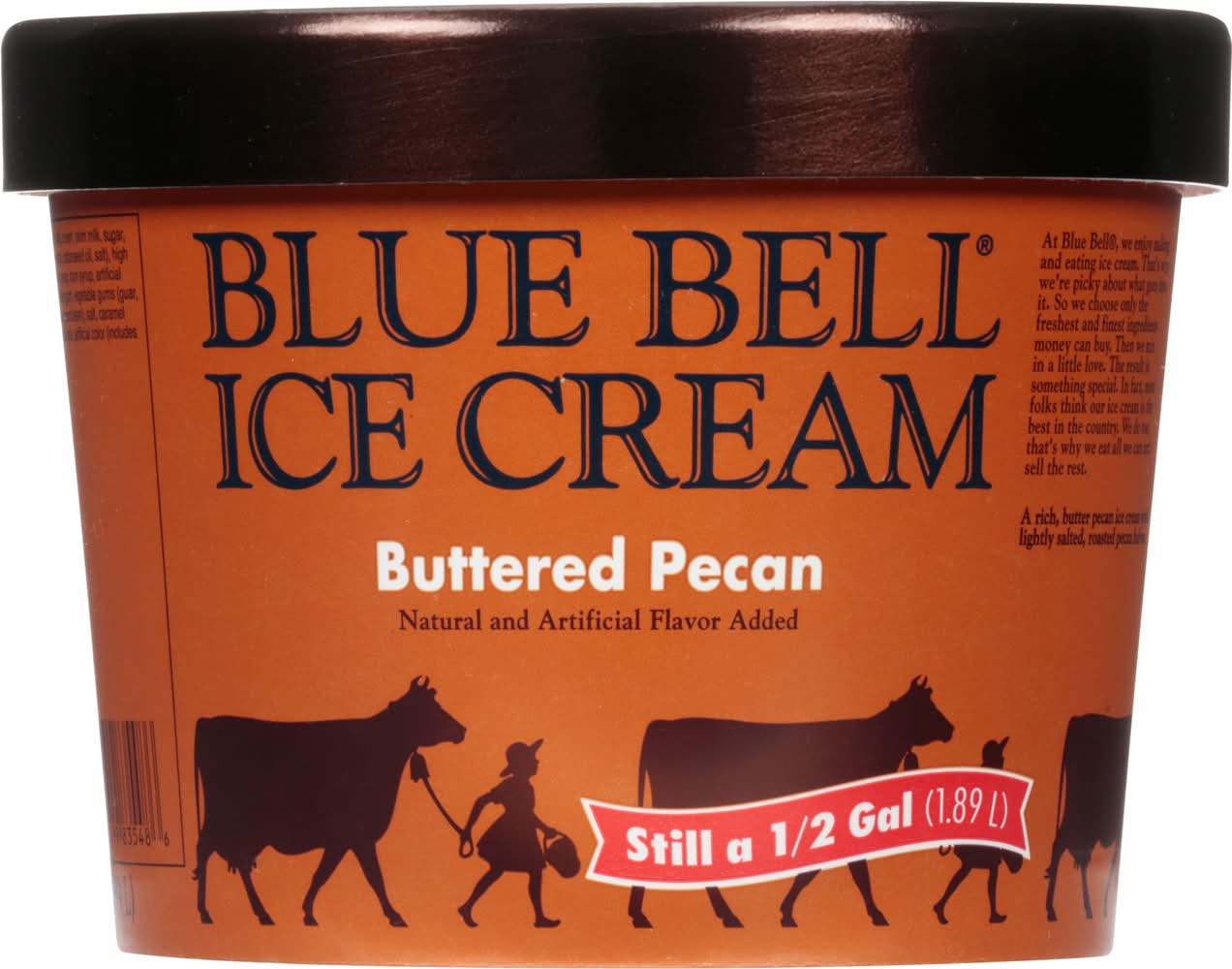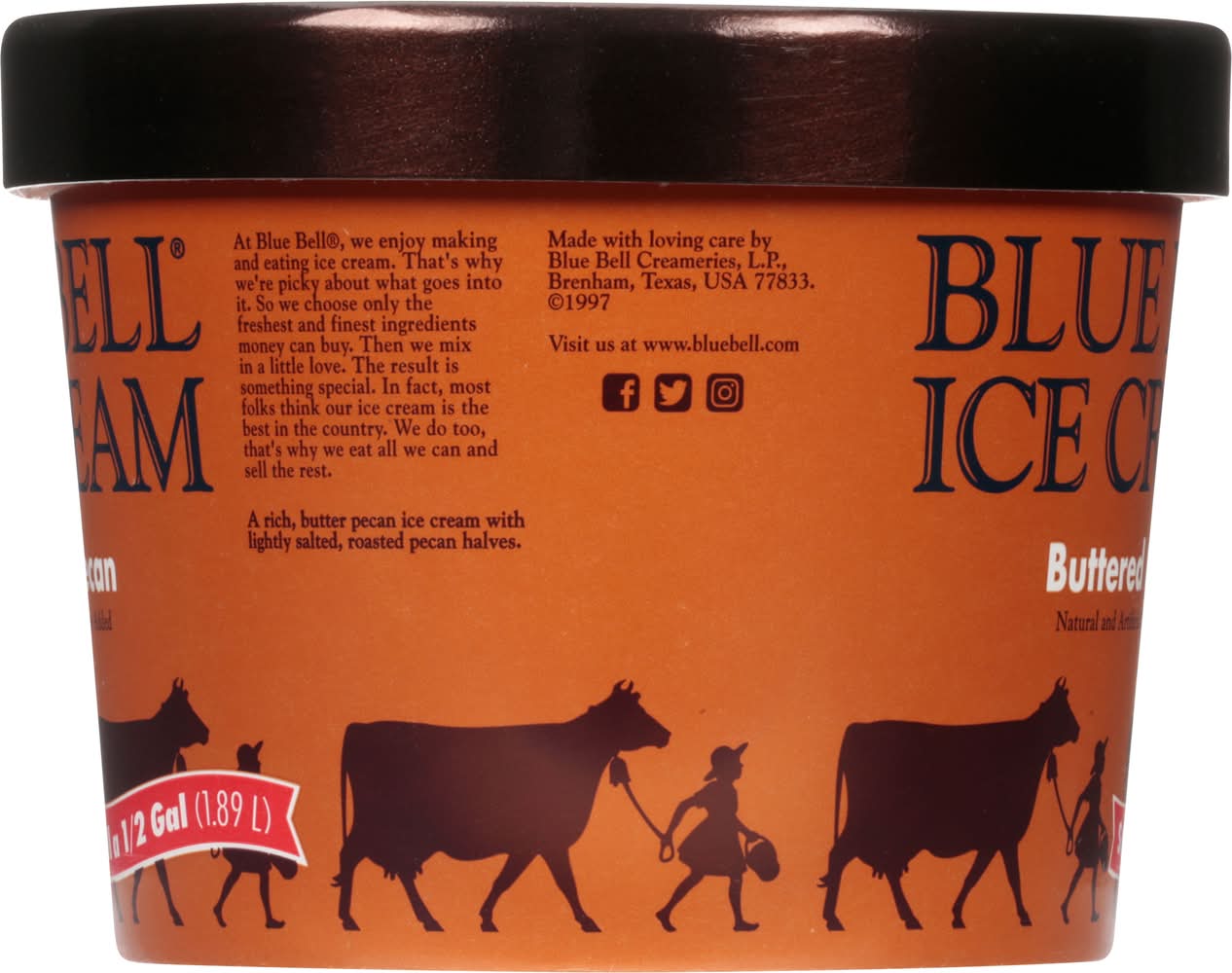 Blue Bell Buttered Pecan is a rich, butter pecan ice cream with lightly salted, roasted pecan halves. A Blue Bell favorite for more than 40 years. At Blue Bell, we enjoy making and eating ice cream and frozen snacks. So we're picky about what goes into them. We use only the freshest and finest ingredients for our products. Then we mix in a little love. The end result is something special. That's why we eat all we can and sell the rest! For more information on Blue Bell, please visit bluebell.com Flavor: Buttered pecan