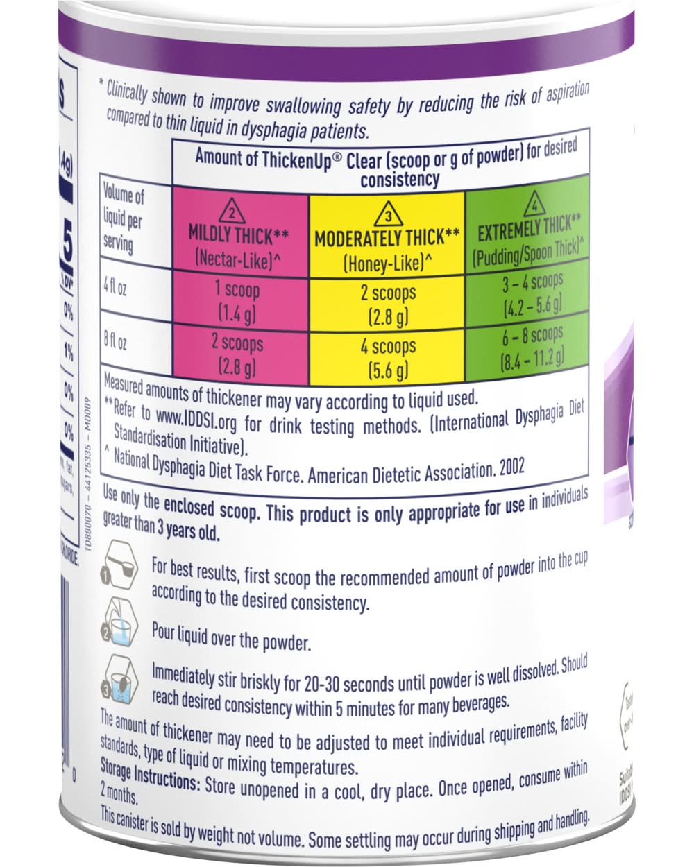 Directions for use: Directions: Amount of ThickenUp Clear (scoop or g of powder) for desired consistency: 4 fl oz volume of liquid per serving; 1 scoop (1.4 g) (2) mildly thick (Refer to www.IDDSI.org for drink testing methods. (International Dysphagia Diet Standardisation Initiative)) (Nectar-Like)(National Dysphagia Diet Task Force. American Dietetic Association. 2002); 2 scoops (2.8 g) (3) moderate thick (Refer to www.IDDSI.org for drink testing methods. (International Dysphagia Diet Standardisation Initiative)) (Honey-Like)(National Dysphagia Diet Task Force. American Dietetic Association. 2002); 3 -4 scoops (4.2 - 5.6 g) (4) extremely thick (Refer to www.IDDSI.org for drink testing methods. (International Dysphagia Diet Standardisation Initiative)) (Pudding/Spoon Thick)(National Dysphagia Diet Task Force. American Dietetic Association. 2002). 8 fl oz volume of liquid per serving; 2 scoops (2.8 g) (2) mildly thick (Refer to www.IDDSI.org for drink testing methods. (International Dysphagia Diet Standardisation Initiative)) (Nectar-Like)(National Dysphagia Diet Task Force. American Dietetic Association. 2002); 4 scoops (5.6 g) (3) moderate thick (Refer to www.IDDSI.org for drink testing methods. (International Dysphagia Diet Standardisation Initiative)) (Honey-Like)(National Dysphagia Diet Task Force. American Dietetic Association. 2002); 6-8 scoops (8.4-11.2 g) (4) extremely thick (Refer to www.IDDSI.org for drink testing methods. (International Dysphagia Diet Standardisation Initiative)) (Pudding/Spoon Thick)(National Dysphagia Diet Task Force. American Dietetic Association. 2002). Use only the enclosed scoop. This product is only appropriate for use in individuals greater than 3 years old.1. For best results, first scoop the recommended amount of powder into the cup according to the desired consistency. 2. Pour liquid over the powder. 3. Immediately stir briskly for 20-30 seconds until powder is well dissolved. Should reach desired consistency within 5 minutes for many beverages. The amount of thickener may need to be adjusted to meet individual requirements, facility standards, type of liquid or mixing temperatures. Storage Instructions: Store unopened in a cool, dry place. Once opened, consume within 2 months. Lot number/Exp by: see bottom of the can. Storage recommendation: Storage Instructions: Store unopened in a cool, dry place. Once opened, consume within 2 months.