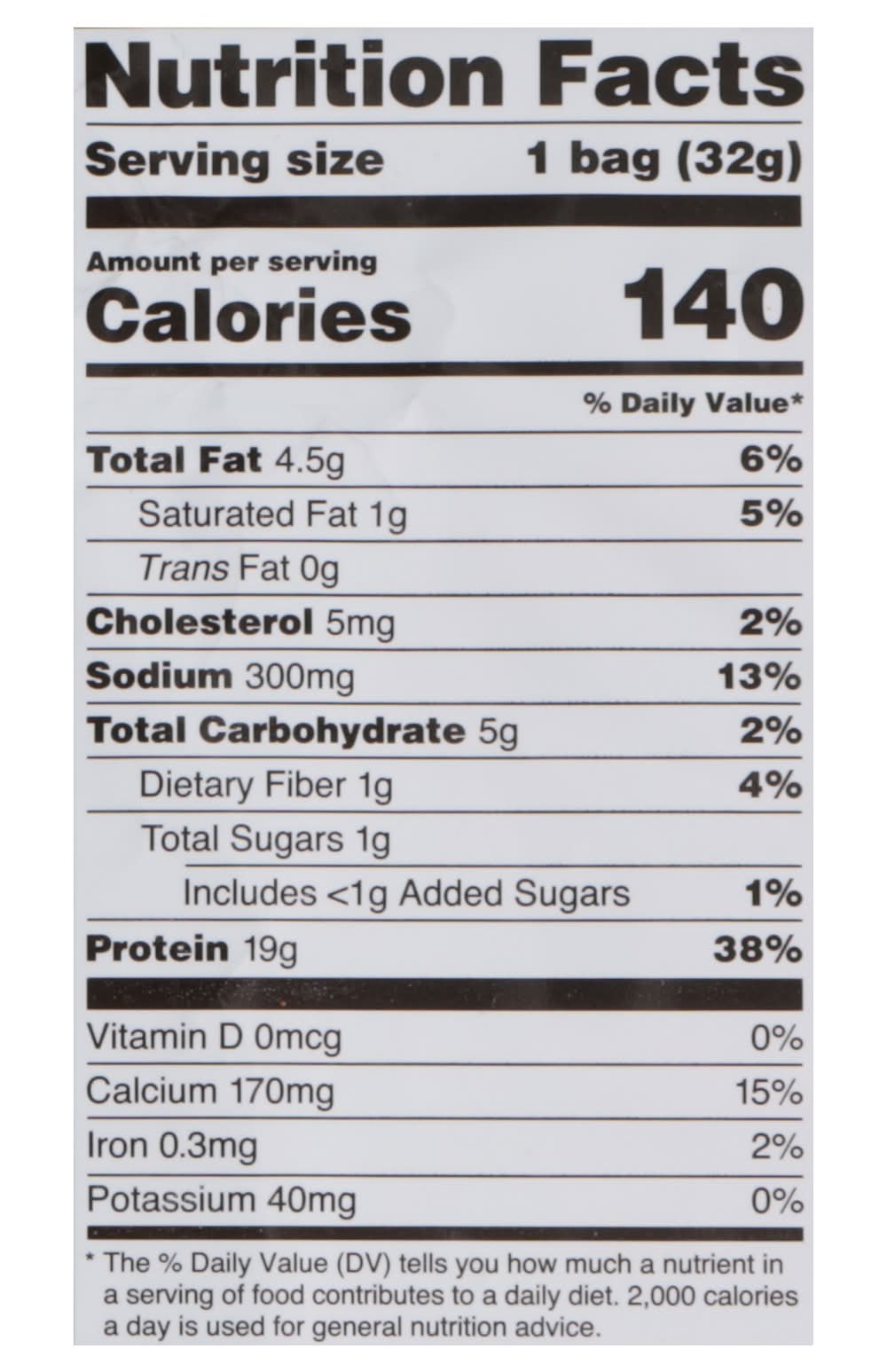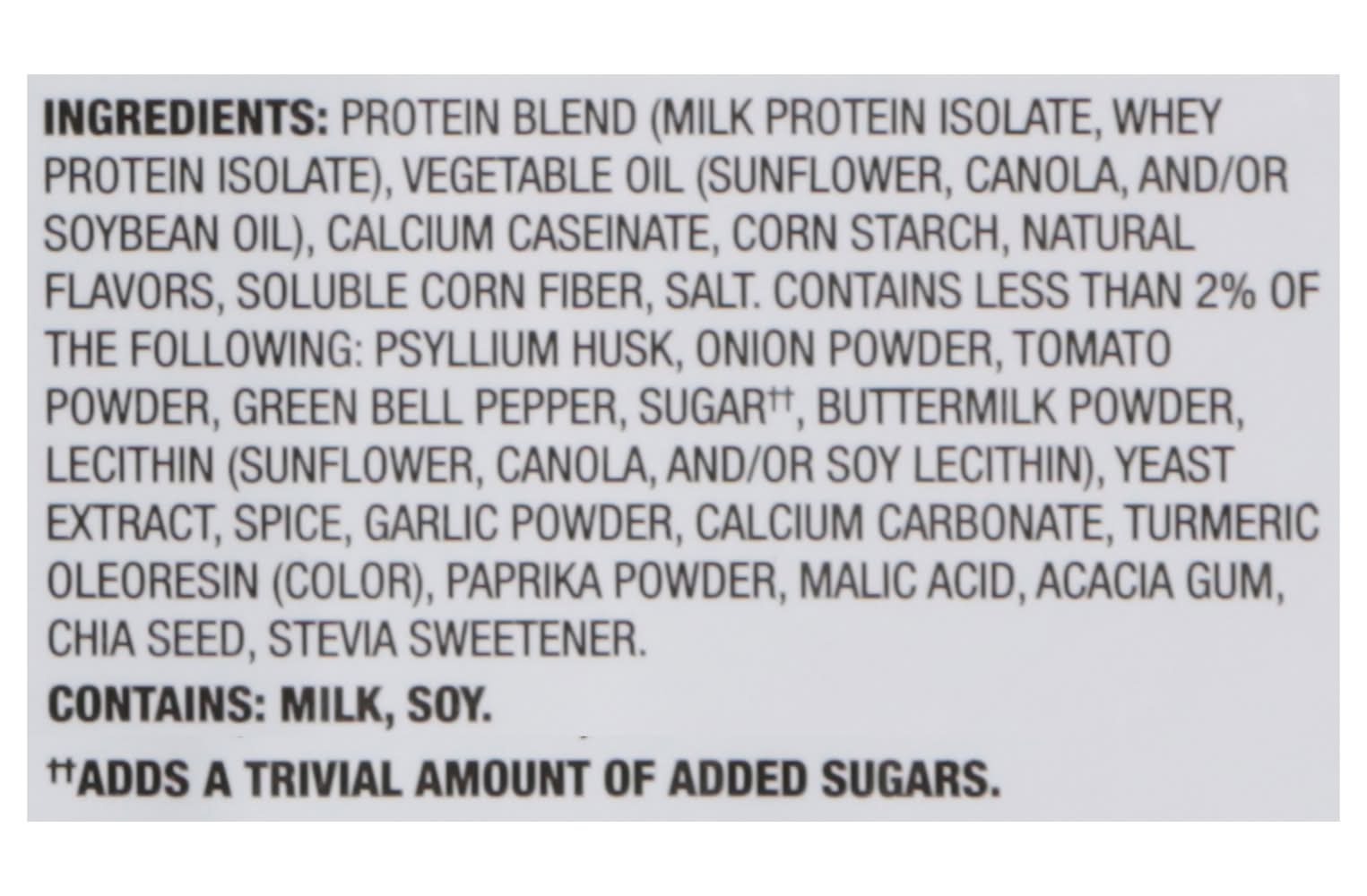 Ingredients: Protein Blend (Milk Protein Isolate, Whey Protein Isolate), Vegetable Oil (Sunflower, Canola, and/or Soybean Oil), Calcium Caseinate, Corn Starch, Natural Flavors, Soluble Corn Fiber, Salt. Contains Less than 2% of the Following: Psyllium Husk, Onion Powder, Tomato Powder, Green Bell Pepper, Sugar(a), Buttermilk Powder, Lecithin (Sunflower, Canola, and/or Soy Lecithin), Yeast Extract, Spice, Garlic Powder, Calcium Carbonate, Turmeric Oleoresin (Color), Paprika Powder, Malic Acid, Acacia Gum, Chia Seed, Stevia Sweetener. (a) Adds a Trivial Amount of Added Sugars Contains: Milk, Soybeans