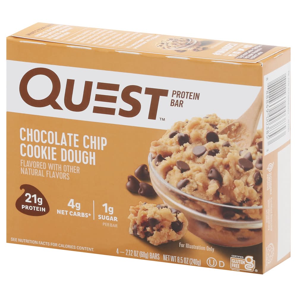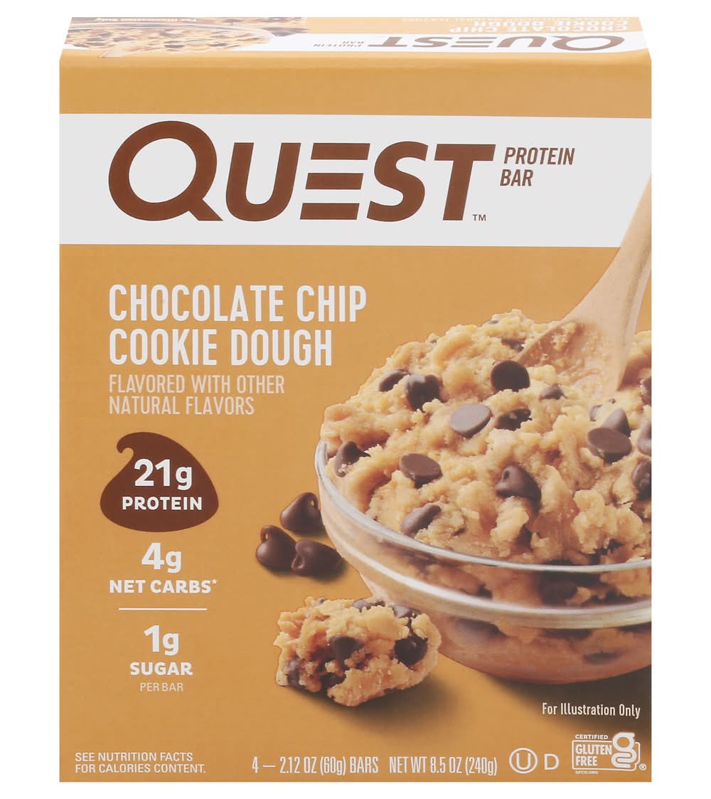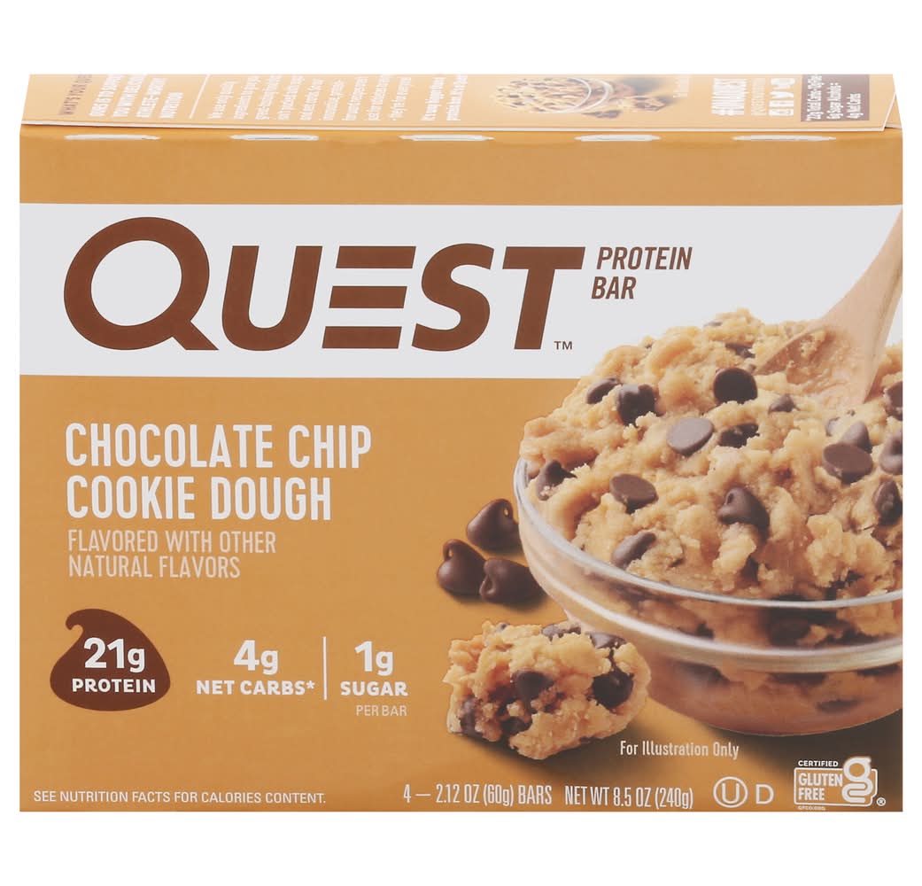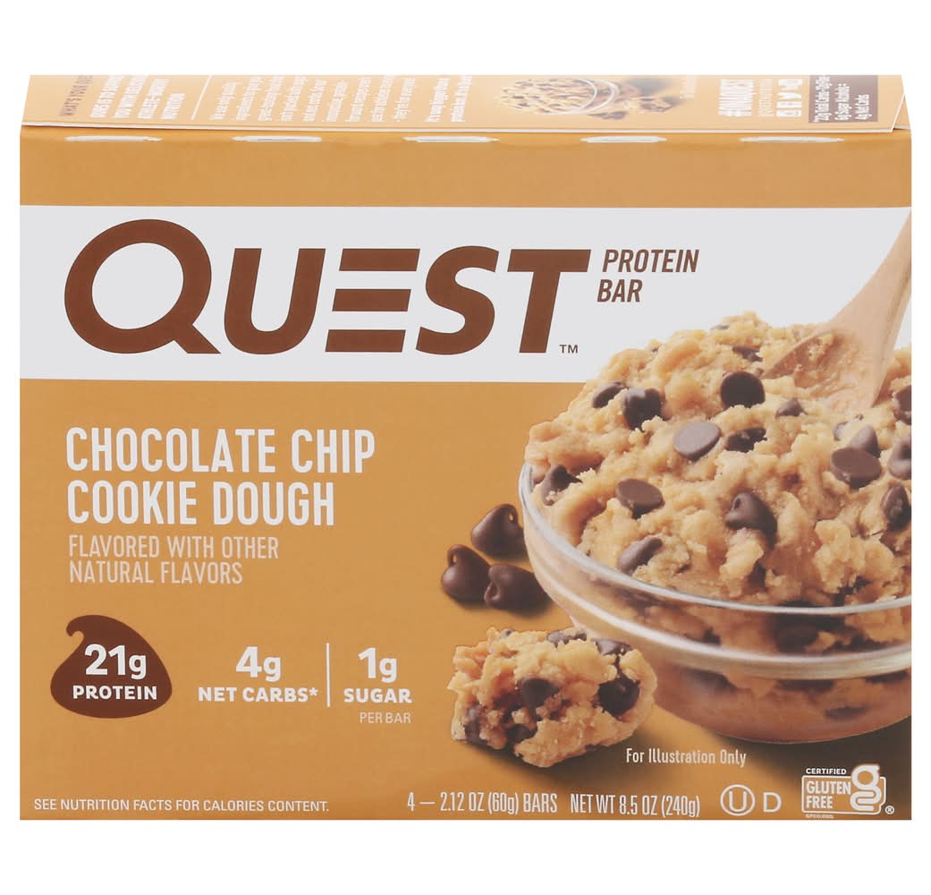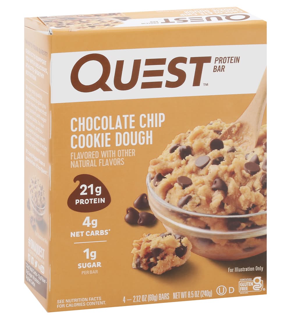 21g Protein 4g Net Carbs per serving* 1g Sugar 12g Fiber Chocolate Chip Cookie Dough Flavor Certified Gluten Free Made in US • Flavor: Chocolate chip cookie dough • Pack size: 4 • Quest Nutrition, LLC, El Segundo,Ca,90245