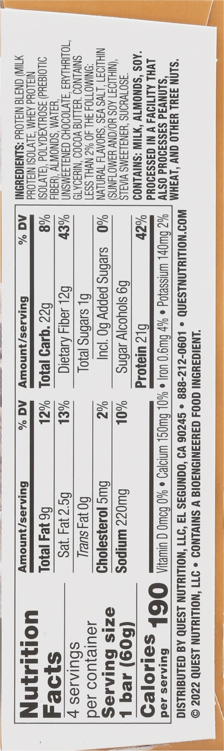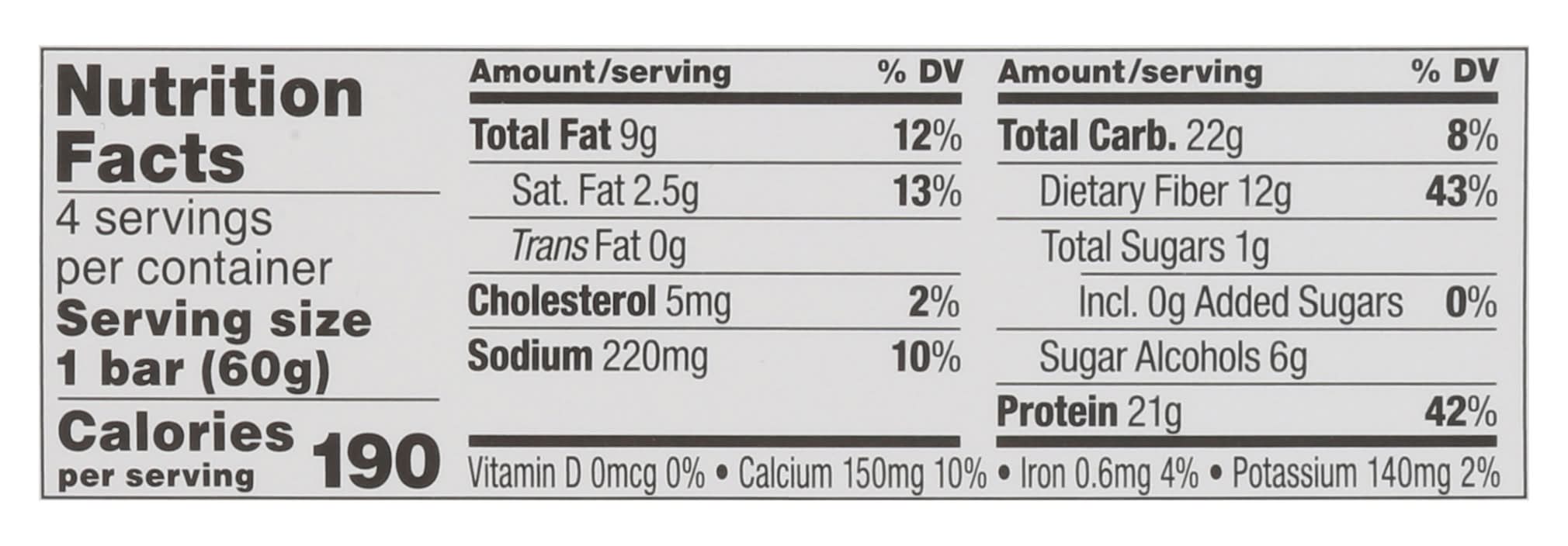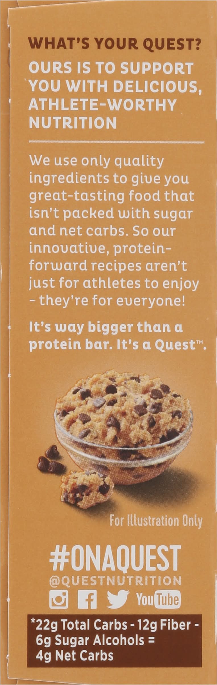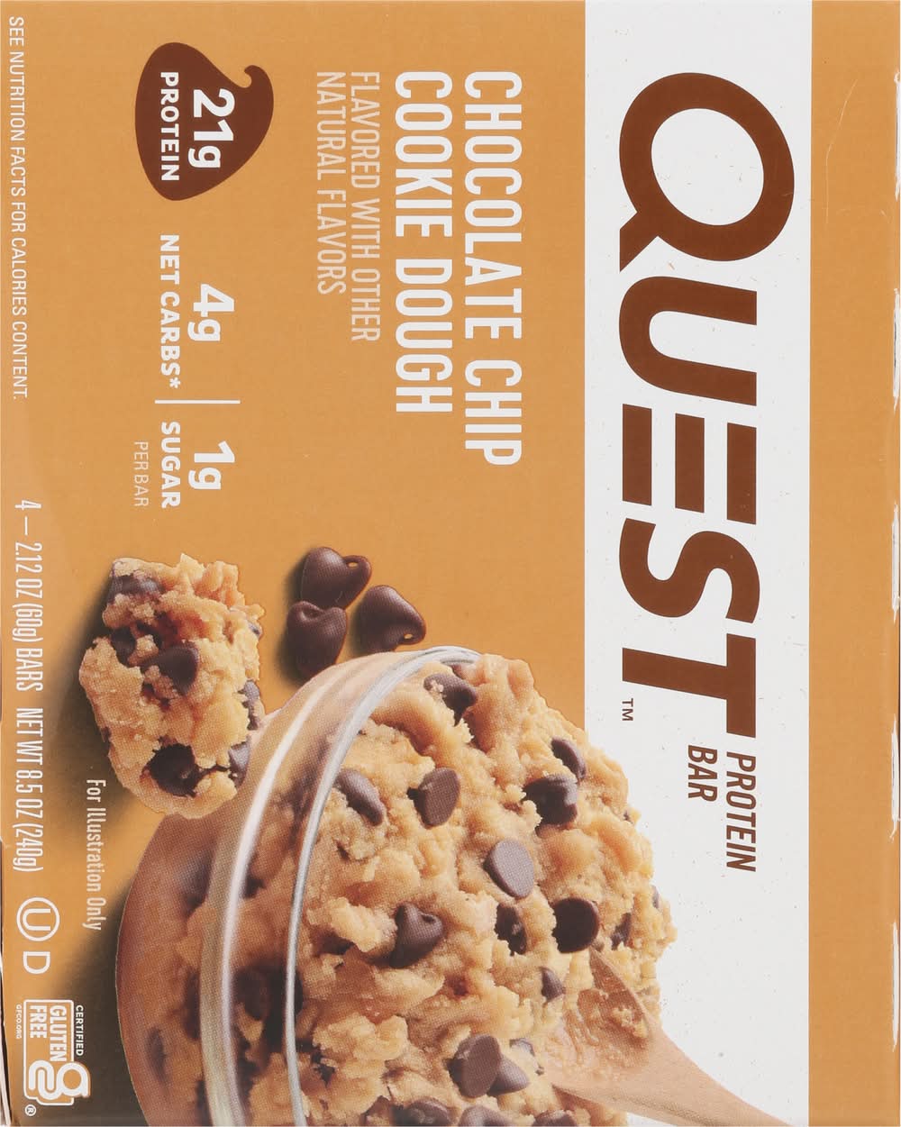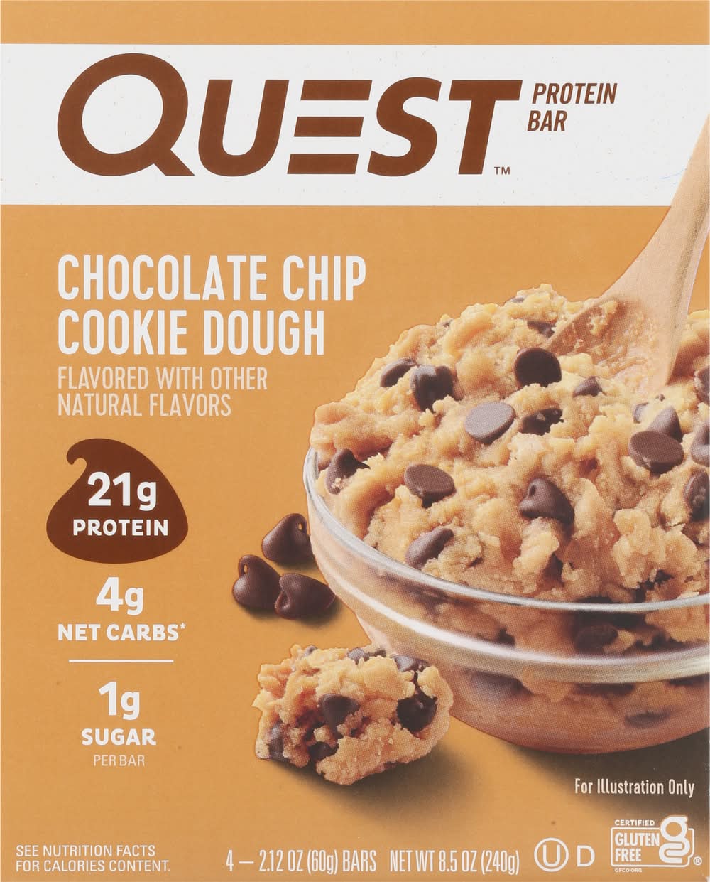21g Protein 4g Net Carbs per serving* 1g Sugar 12g Fiber Chocolate Chip Cookie Dough Flavor Certified Gluten Free Made in US • Flavor: Chocolate chip cookie dough • Pack size: 4 • Quest Nutrition, LLC, El Segundo,Ca,90245