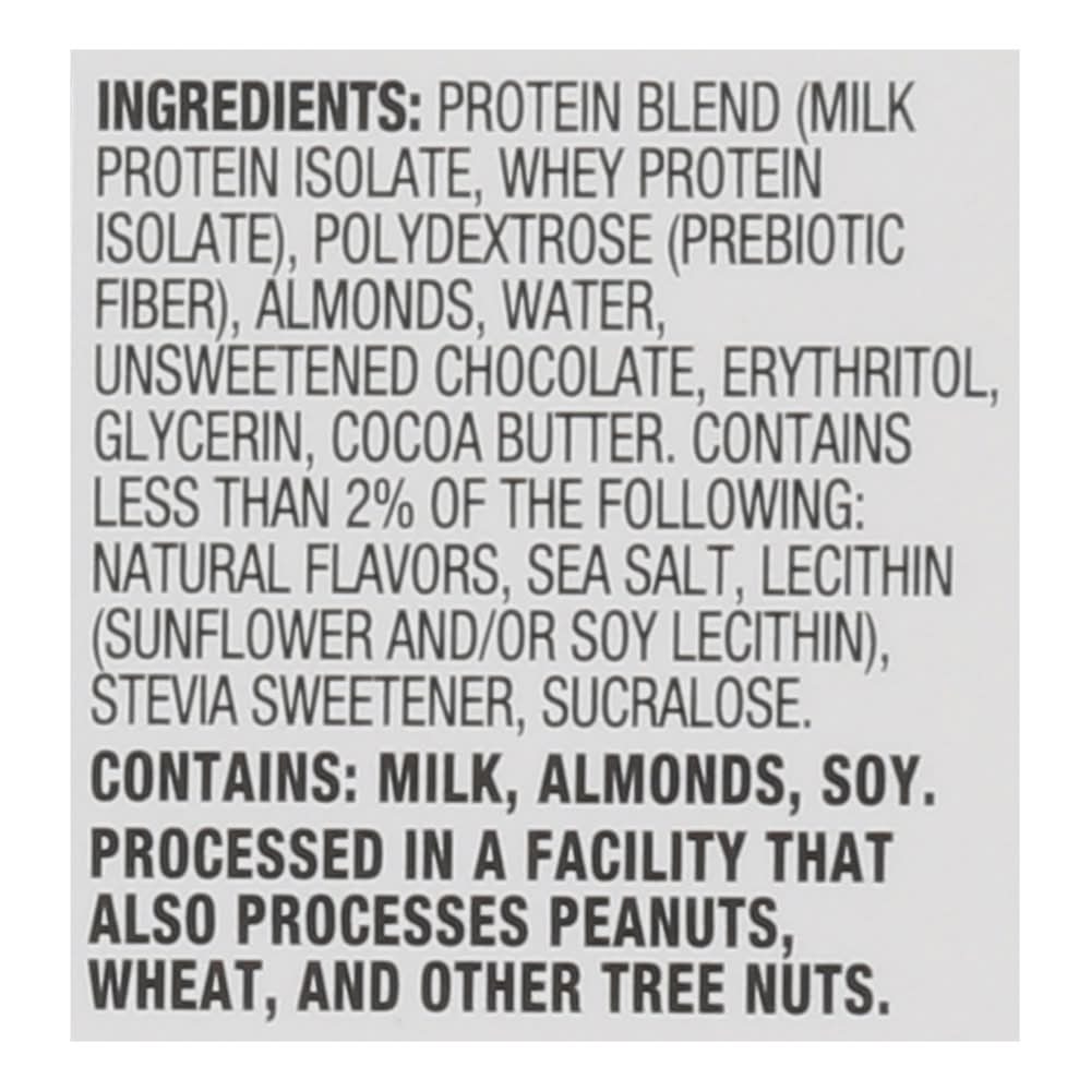 Ingredients: Protein Blend (Milk Protein Isolate, Whey Protein Isolate), Polydextrose (Prebiotic Fiber), Almonds, Water, Unsweetened Chocolate, Erythritol, Glycerin, Cocoa Butter, Contains Less than 2% of the Following: Natural Flavors, Sea Salt, Lecithin (Sunflower and/or Soy Lecithin), Stevia Sweetener, Sucralose Contains: Milk, Tree Nuts, Almonds, Soybeans, Peanuts, Wheat, Tree Nuts