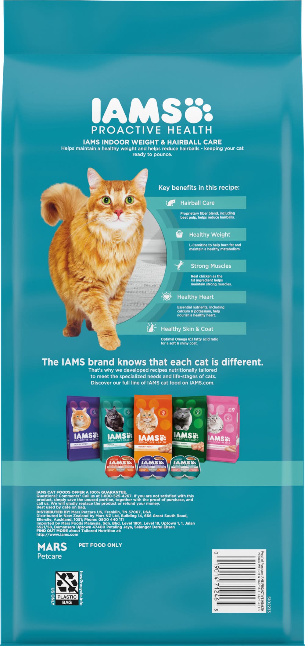 Premium cat nutrition. Veterinarians recommend . Weight and hairball care. Designed to support the optimal health of indoor cats. Real chicken is the 1st ingredient. Helps maintain a healthy weight & helps reduce hairballs. 100% Complete & balanced adult nutrition. 0% Fillers. indoor weight & hairball care helps maintain a healthy weight and helps reduce hairballs- keeping your cat ready to pounce. Key benefits in this recipe: Hairball Care: Proprietary fiber blend, including beet pulp, helps reduce hairballs. Healthy Weight: L-Carnitine to help burn fat and maintain a healthy metabolism. Strong Muscles: Real chicken as the 1st ingredient helps maintain strong muscles. Healthy heart: Essential nutrients, including calcium & potassium, help nourish a healthy heart. Healthy Skin & Coat: Optimal Omega 6:3 fatty acid ratio for a soft & shiny coat. The brand know that each cat is different. That’s why we developed recipes nutritionally tailored to meet the specialized needs and life-stages of cats. Mars Petcare. Pet food only. cat foods offer a 100% Guarantee. If you are not satisfied with this product, simply save the unused portion, together with the proof of purchase, and call us. We will gladly replace the product or refund your money. Mars Petcare, Ovation Pkwy, Franklin, Tn 37067.