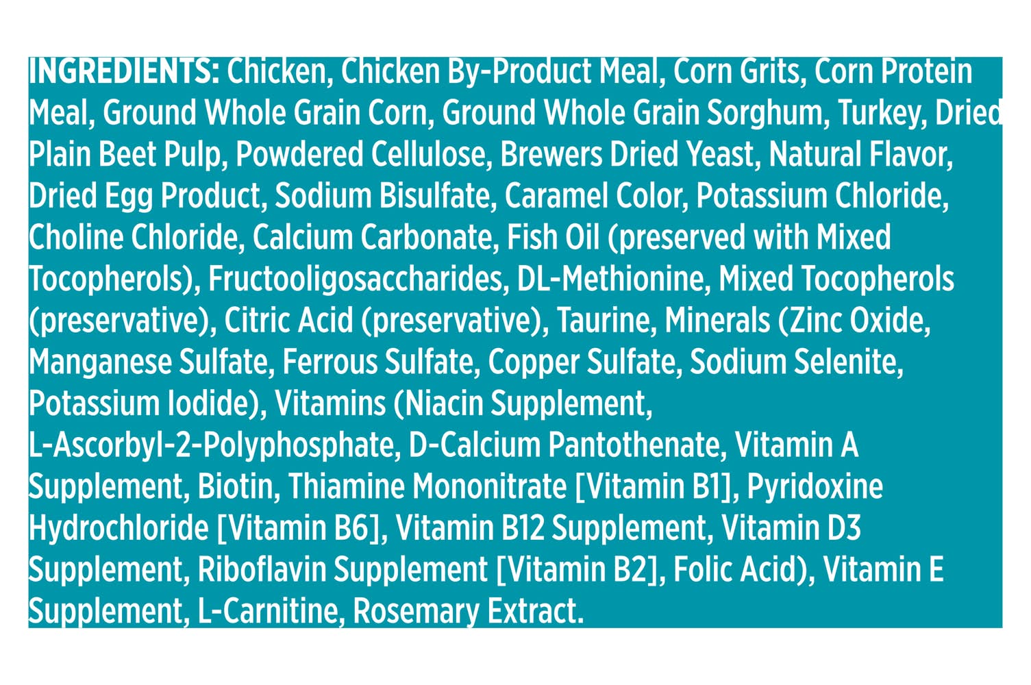 Ingredients: Chicken, Chicken By-Product Meal, Corn Grits, Corn Protein Meal, Ground Whole Grain Corn, Ground Whole Grain Sorghum, Turkey, Dried Plain Beet Pulp, Powdered Cellulose, Brewers Dried Yeast, Natural Flavor, Dried Egg Product, Sodium Bisulfate, Caramel Color, Potassium Chloride, Choline Chloride, Calcium Carbonate, Fish Oil (Preserved with Mixed Tocopherols), Fructooligosaccharides, DL-Methionine, Mixed Tocopherols (Preservative), Citric Acid (Preservative), Taurine, Minerals (Zinc Oxide, Manganese Sulfate, Ferrous Sulfate, Copper Sulfate, Sodium Selenite, Potassium Iodide), Vitamins (Niacin Supplement, L-Ascorbyl-2-Polyphosphate, D-Calcium Pantothenate, Vitamin A Supplement, Biotin, Thiamine Mononitrate [Vitamin B1], Pyridoxine Hydrochloride [Vitamin B6], Vitamin B12 Supplement, Vitamin D3 Supplement, Riboflavin Supplement [Vitamin B2], Folic Acid), Vitamin E Supplement, L-Carnitine, Rosemary Extract Contains: Eggs, Fish