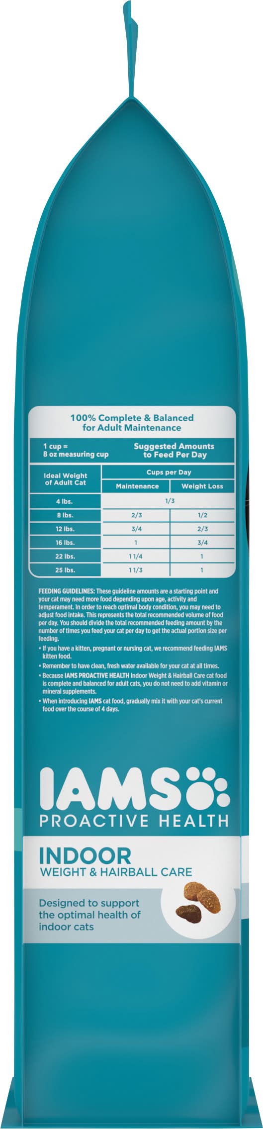 Feeding guidelines: these guideline amounts are a starting point and your cat may need more food depending upon age, activity and temperament. in order to reach optimal body condition, you may need to adjust food intake. this represents the total recommended volume of food per day. you should divide the total recommended feeding amount by the number of times you feed your cat per day to get the actual portion size per feeding. if you have a kitten, pregnant or nursing cat, we recommend feeding iams kitten food. remember to have clean, fresh water available for your cat at all times. because iams indoor weight & hairball care cat food is complete and balanced for maintenance, you do not need to add vitamin or mineral supplements. when introducing iams cat food, gradually mix it with your cat's current food over the course of 4 days.