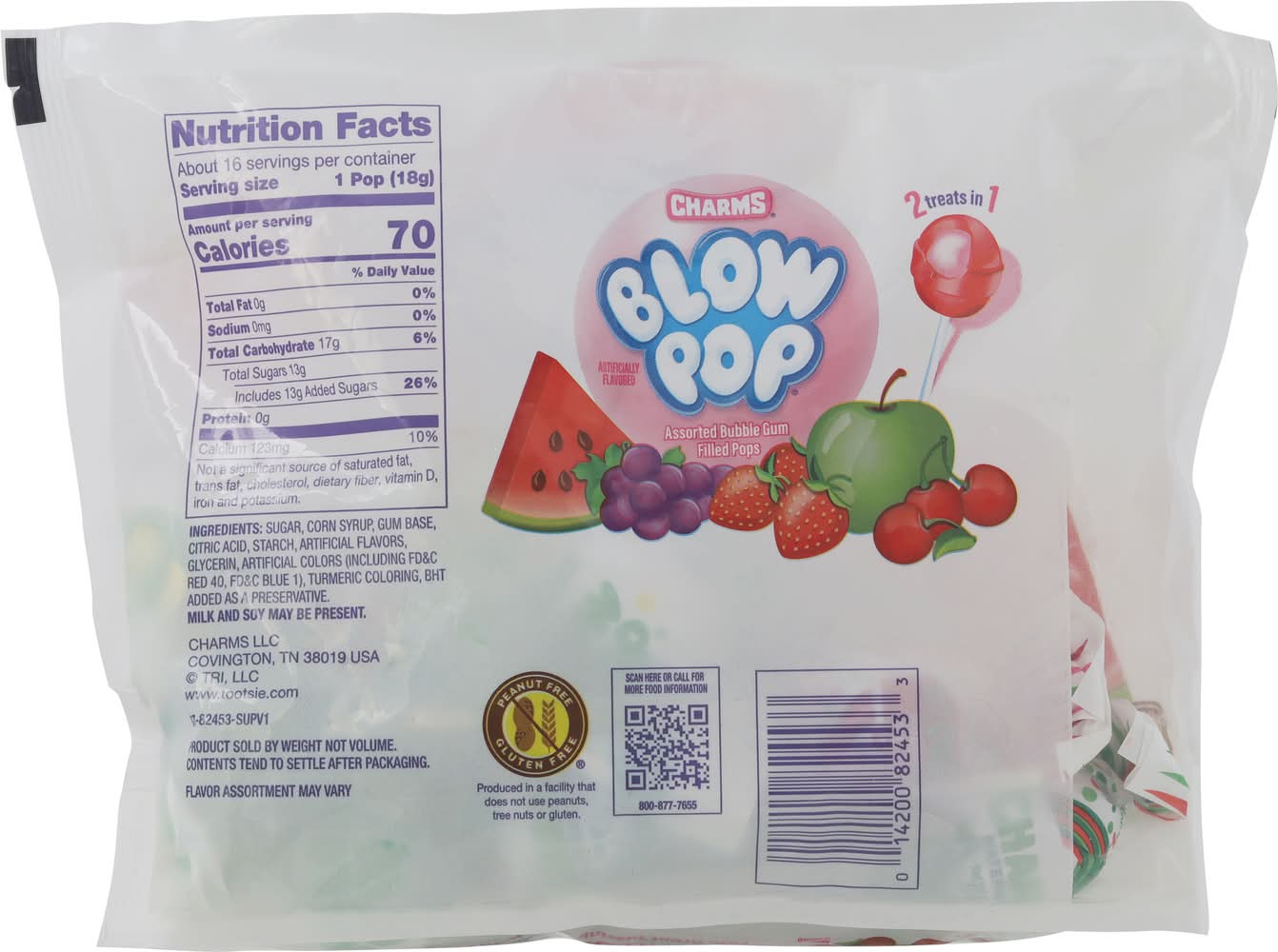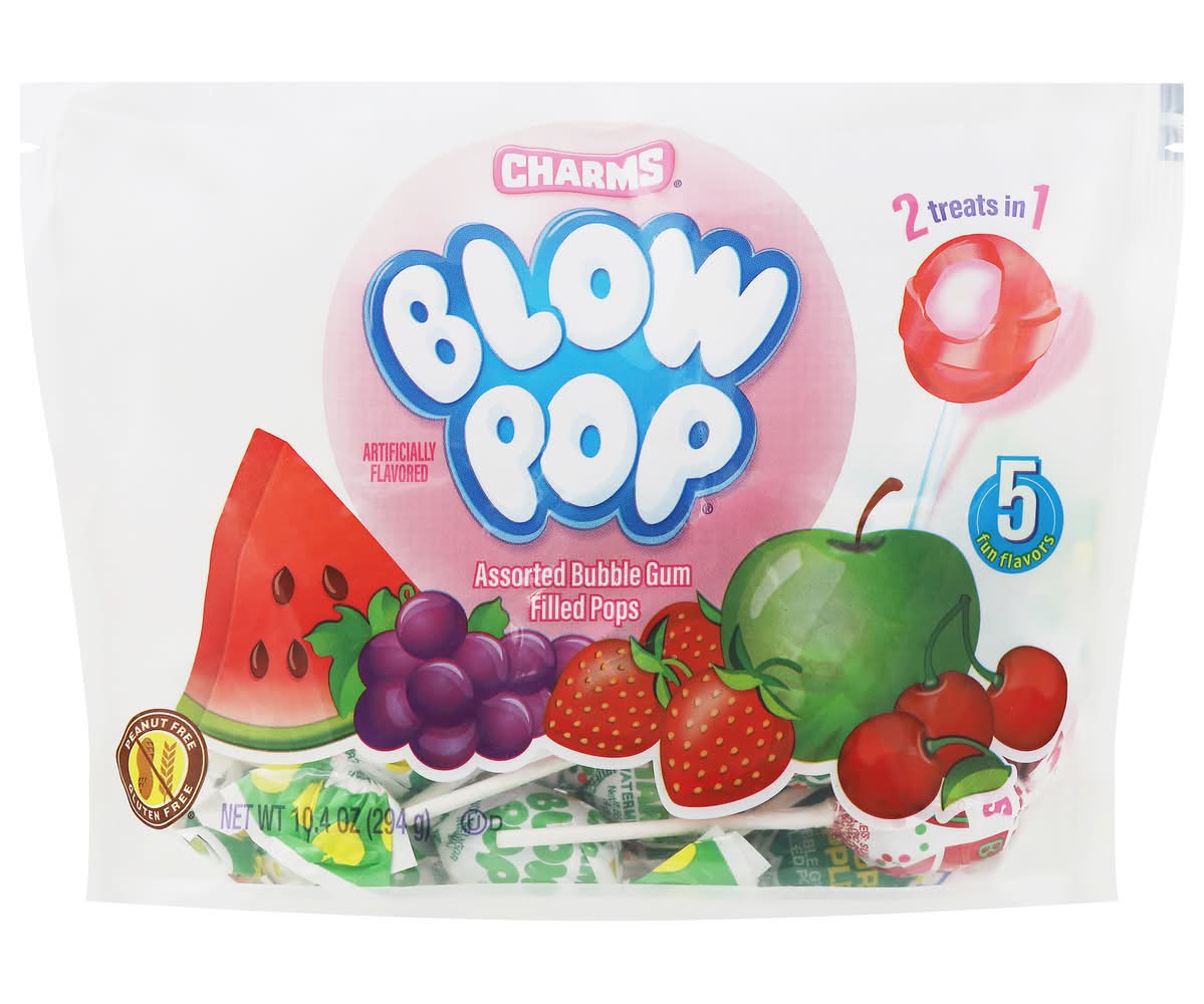 It's two treats in one with Charms Blow Pop, a chewy, bubble gum center surrounded by a delicious, fruit-flavored, hard candy shell. Includes a variety of fruity flavors including, Sour Apple, Cherry, Grape, Strawberry and mouthwatering Watermelon. Made in United States • Flavor: Assorted • Number of servings: 16