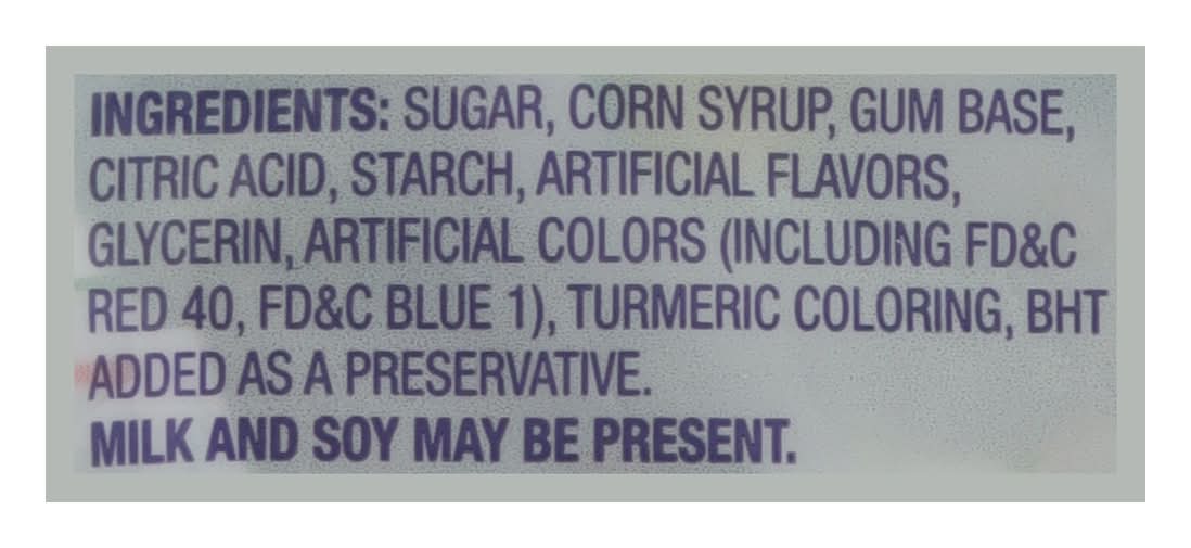 Ingredients: Sugar, Corn Syrup, Gum Base, Citric Acid, Starch, Artificial Flavors, Glycerin, Artificial Colors (Including FD&C Red 40, FD&C Blue 1), Turmeric Coloring, BHT Added as a Preservative Contains: Corn, Milk, Soybeans