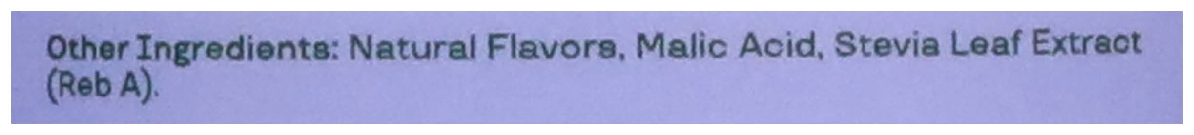Ingredients: Other Ingredients: Natural Flavors, Malic Acid, Stevia Leaf Extract (Reb a)