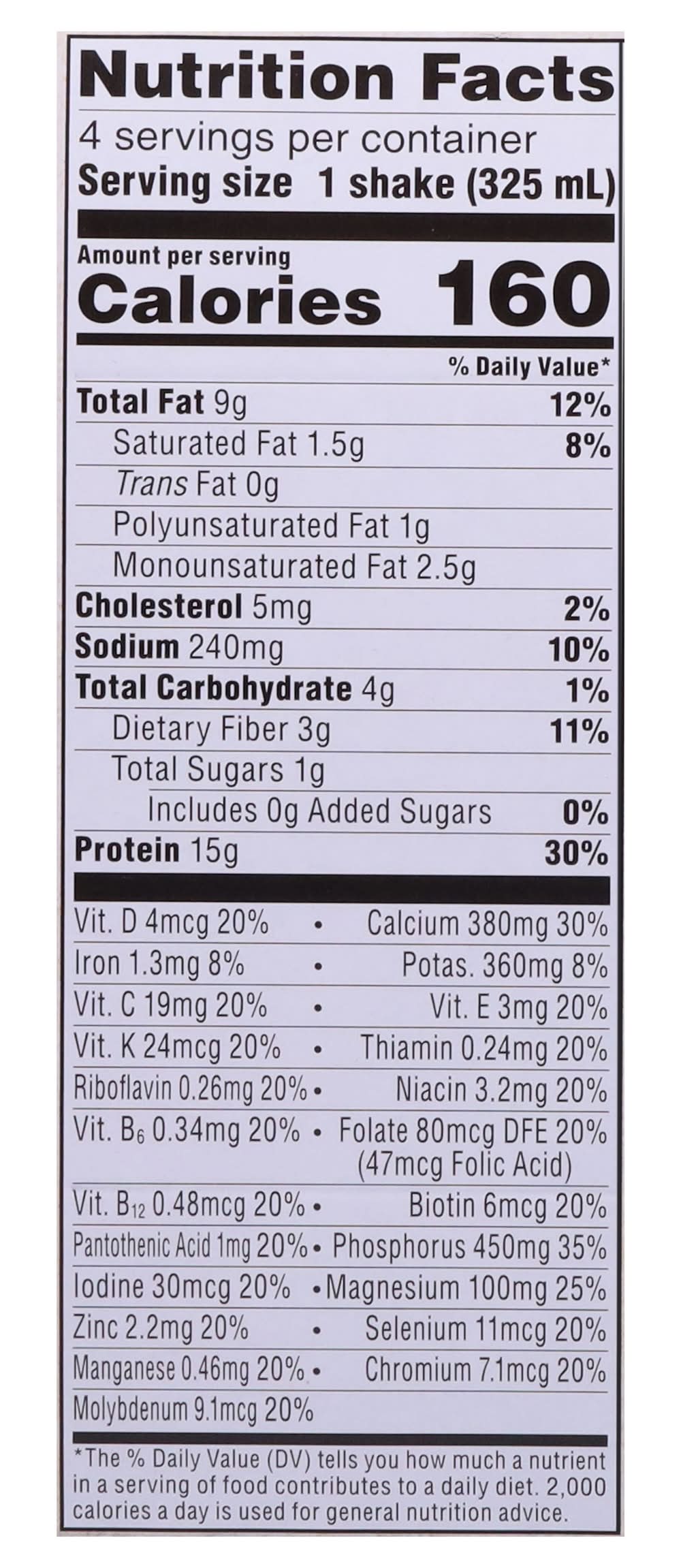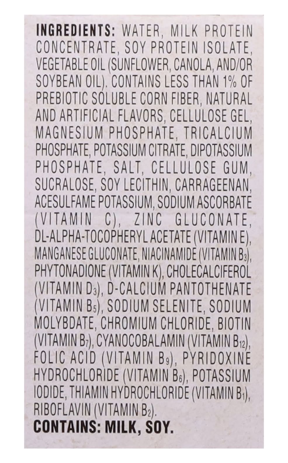 Ingredients: Water, Milk Protein Concentrate, Soy Protein Isolate, Sunflower Oil, Prebiotic Soluble Corn Fiber, Cream, Contains Less than 1% of Natural and Artificial Flavors, Cellulose Gel, Magnesium Phosphate, Potassium Citrate, Dipotassium Phosphate, Tricalcium Phosphate, Salt, Cellulose Gum, Sucralose, Soy Lecithin, Carrageenan, Acesulfame Potassium, Sodium Ascorbate (Vitamin C), Zinc Gluconate, DL-Alpha-Tocopheryl Acetate (Vitamin E), Manganese Gluconate, Niacinamide (Vitamin B3), Phytonadione (Vitamin K), Cholecalciferol (Vitamin D3), D-Calcium Pantothenate (Vitamin B₁), Sodium Selenite, Sodium Molybdate, Chromium Chloride, Biotin (Vitamin B₁), Cyanocobalamin (Vitamin B12), Folic Acid (Vitamin B9), Pyridoxine Hydrochloride (Vitamin B6), Potassium Iodide, Thiamin Hydrochloride (Vitamin B₁), Riboflavin (Vitamin B₂) Contains: Milk, Soybeans, Corn
