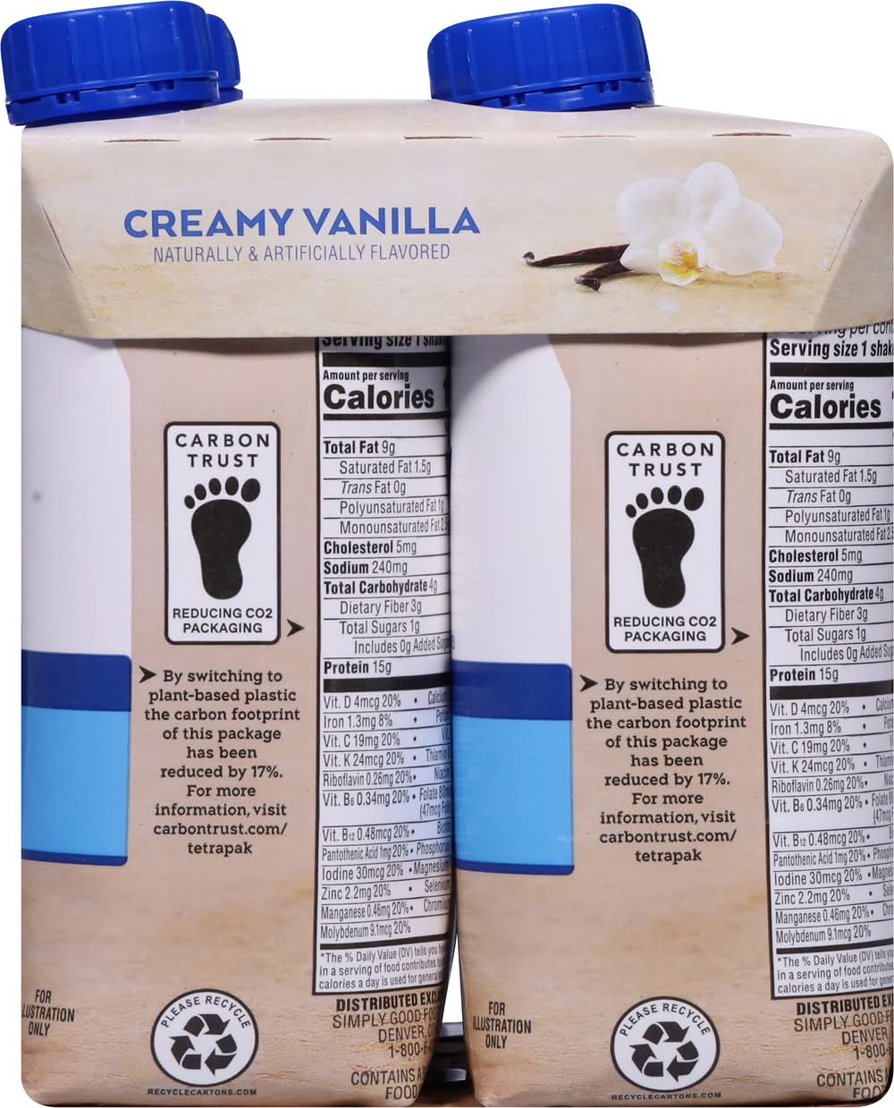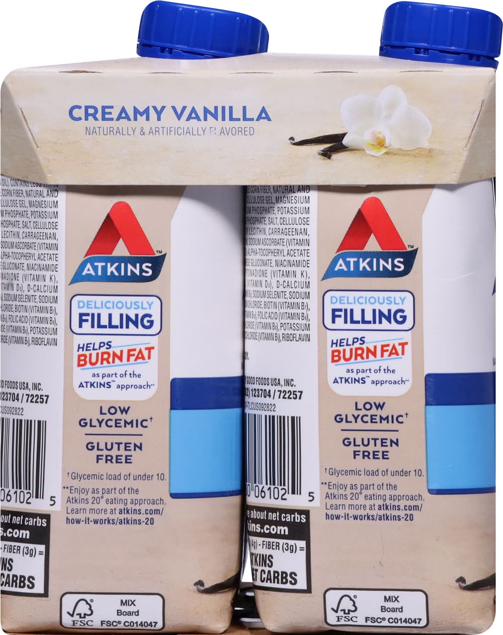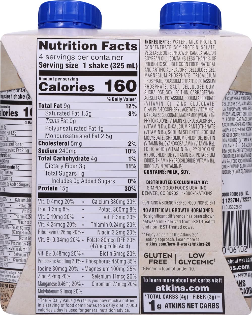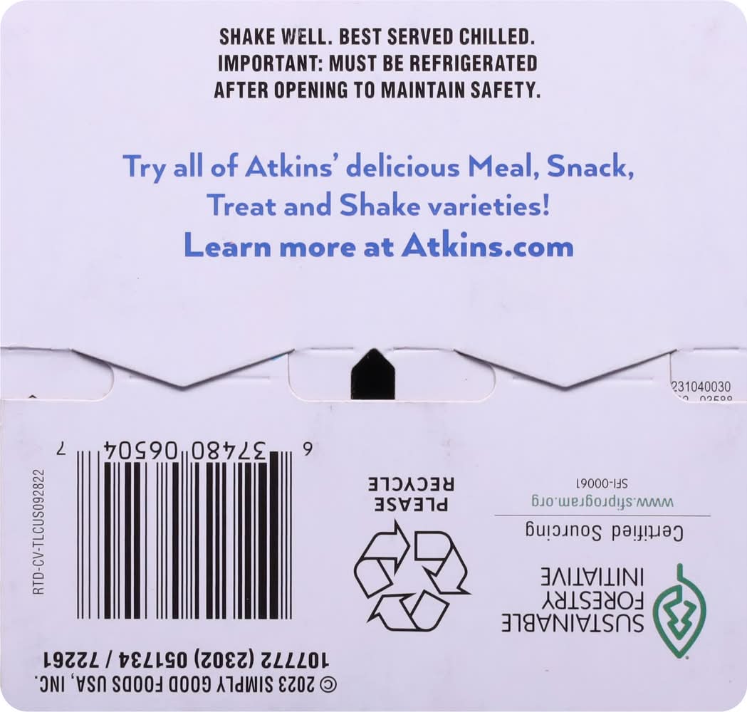 Contains a bioengineered food ingredient. Deliciously filling. Helps burn fat as part of the approach (Enjoy as part of the Atkins 20 eating approach). No artificial growth hormones. No significant difference has been shown between milk derived from rbst-treated and non rbst-treated cows. atkins.com. Learn more at atkins.com/how-it-works/atkins-20. To learn more about net carbs visit Try all of delicious meal, snack, treat and shake varieties. • Flavor: Vanilla • Pack size: 4 • Simply Good Foods USA, Inc., Denver, CO, 80202 • Packaging: Reusable
