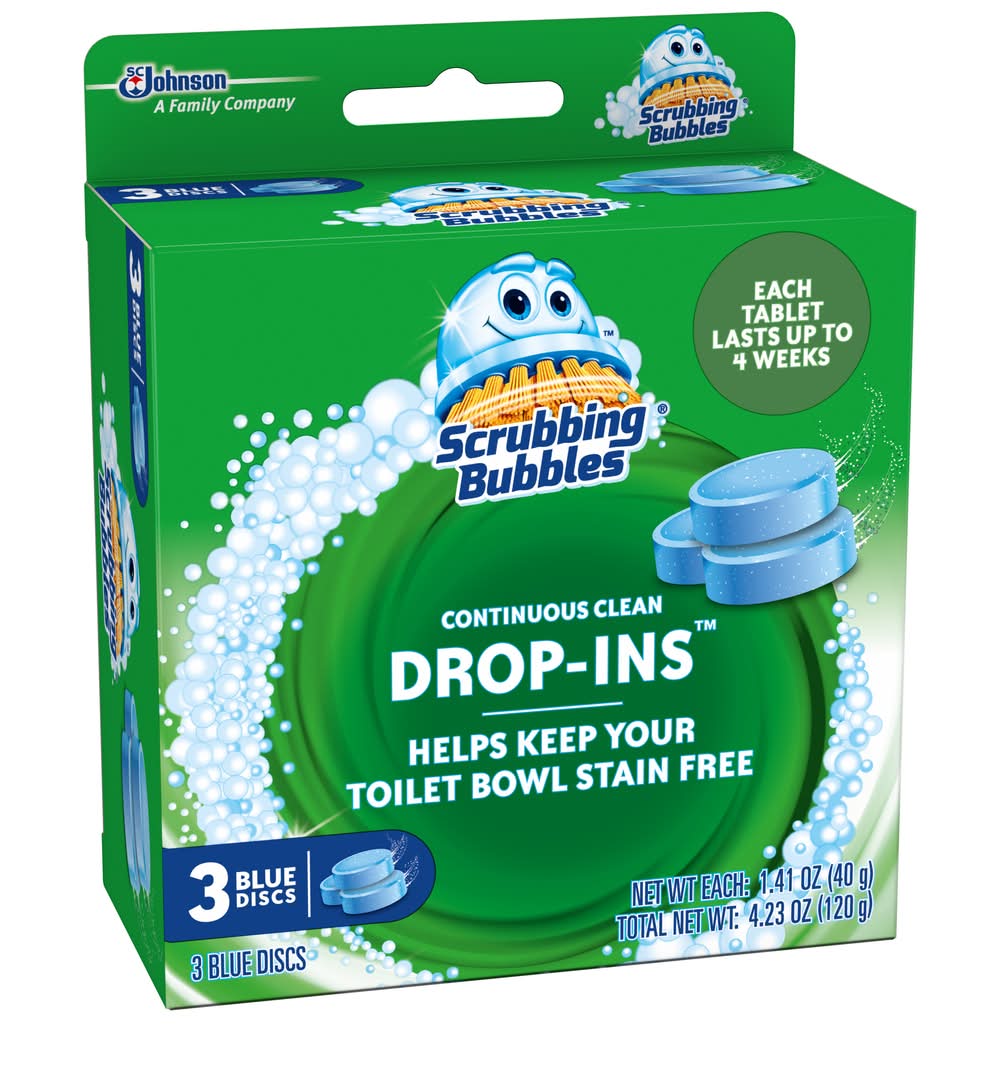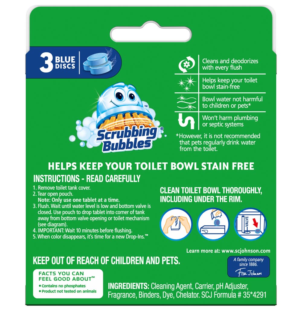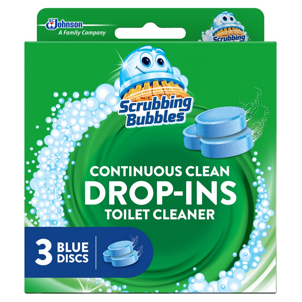 Keep your toilet bowl stain-free for up to four weeks with Scrubbing Bubbles Drop-Ins Toilet Cleaning Tablets Continuous Clean. Designed to combat stains from hard water, minerals, and limescale, these tablets offer a convenient solution for maintaining a fresh and clean toilet with every flush. Simply place a tablet into the toilet tank to activate the cleaning agents, providing effortless and ongoing odor protection for a consistently clean bathroom experience. Pack size: 3