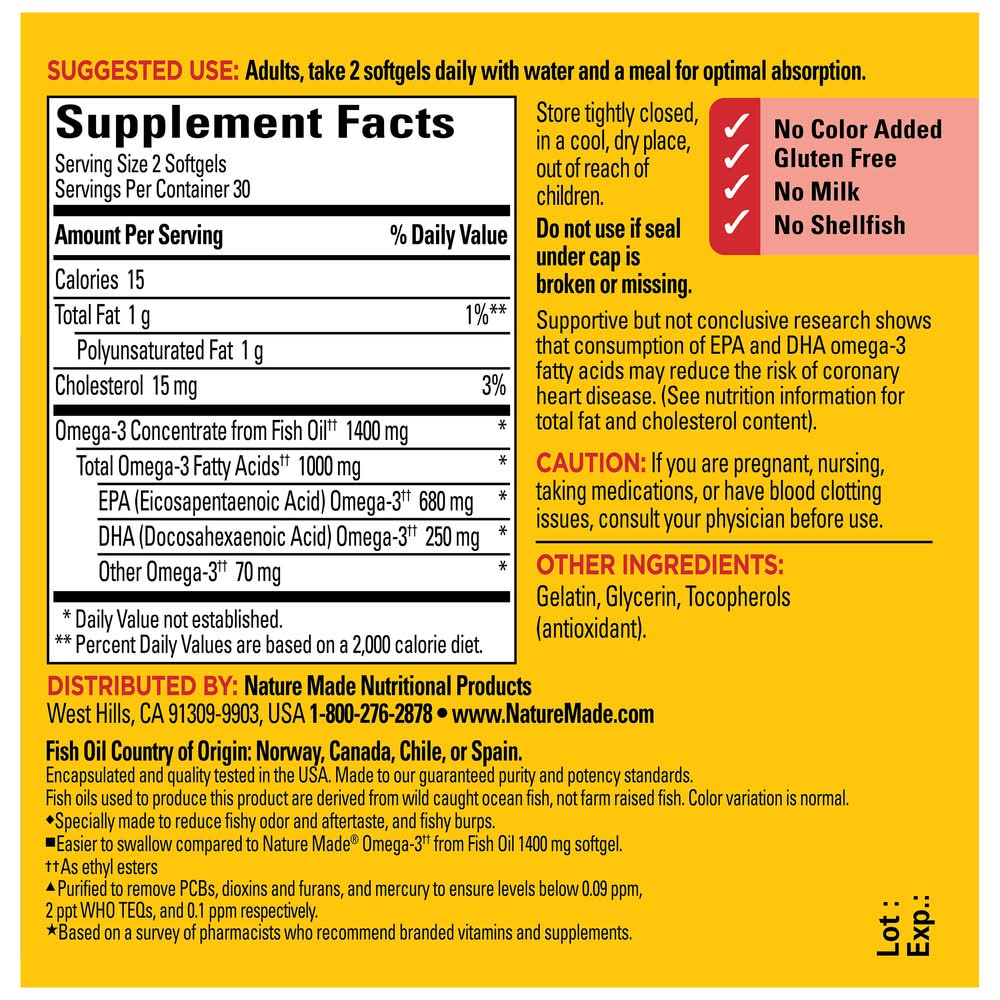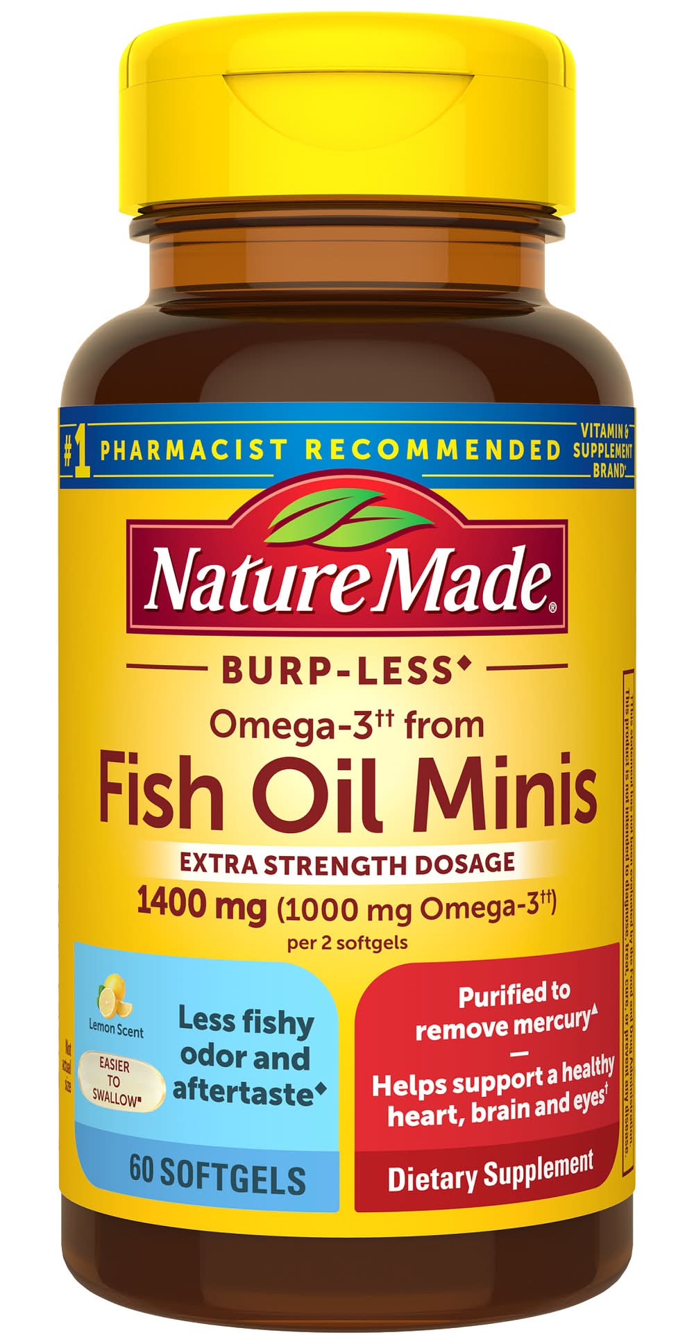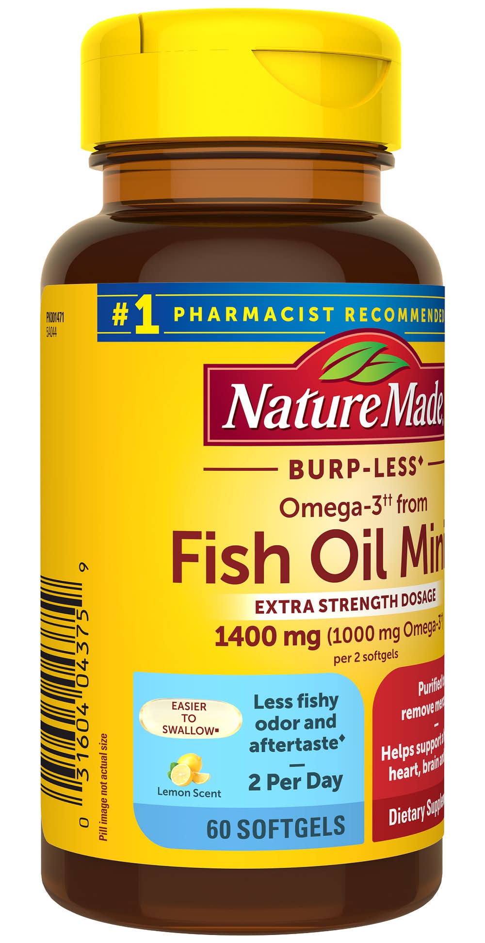 Nature Made Extra Strength Burp Less Omega 3 Fish Oil 1400 mg Minis, 60 Count Packaging: Reusable
