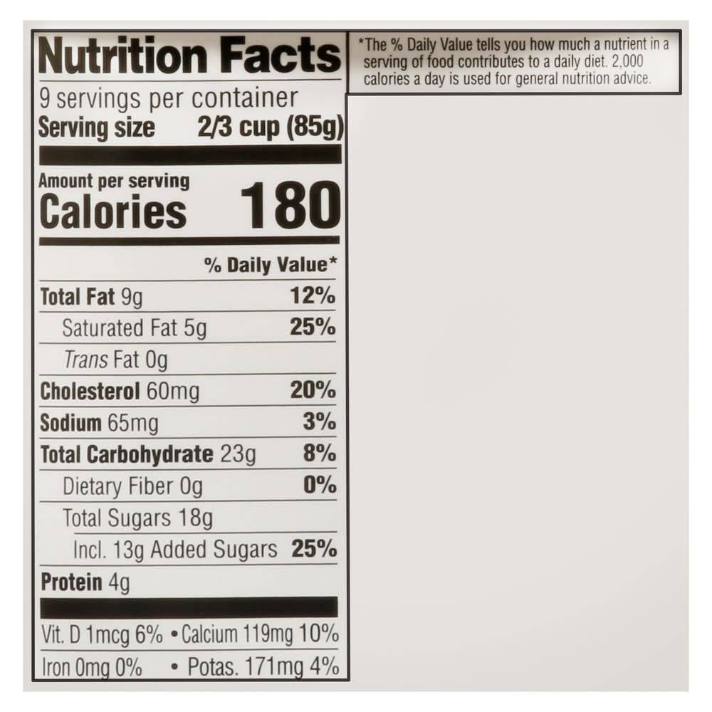 Ingredients: Milk, Cream, Sugar, Corn Syrup, Skim Milk, Egg Yolks, Whey, Water, Color Added, Mono and Diglycerides, Citric Acid, Xanthan and Locust Bean Gum, Natural Flavors, Cellulose Gum, Salt, Guar Gum, Vanilla Contains: Milk, Eggs, Peanuts, Tree Nuts, Soybeans, Wheat