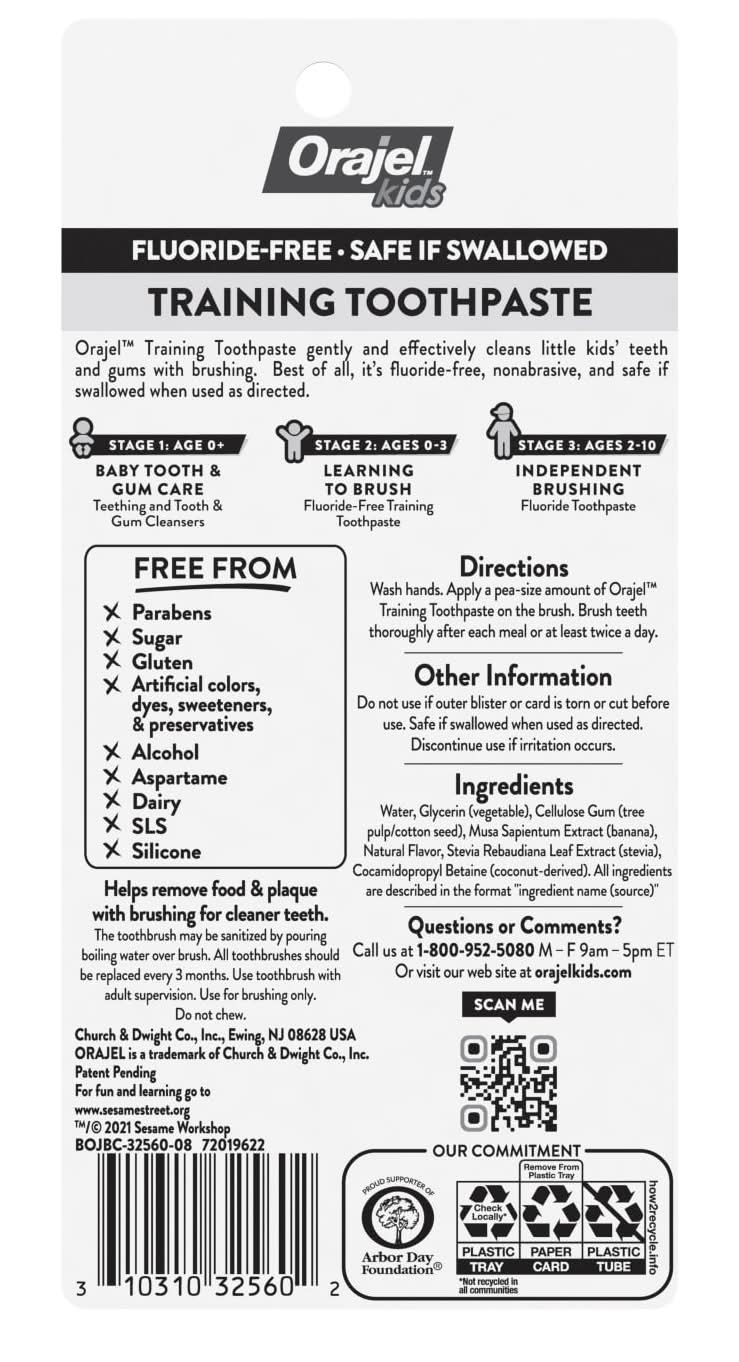 Teaching your little one to brush their teeth takes practice, which is why the Orajel Kids Elmo combo pack is the perfect way to begin a brushing routine! Our kid-sized toothbrush and training toothpaste help gently and effectively clean little kid’s teeth and gums while brushing. Best of all, our training toothpaste is fluoride-free, nonabrasive, and safe if swallowed when used as directed. With 100% naturally sourced ingredients and a great natural banana apple flavor, parents trust Orajel Kids Elmo Fluoride-Free Toothpaste to help their children establish healthy oral care habits. From first tooth to full smile, Orajel has you covered. Proud to be the #1 Pediatrician Recommended Fluoride-Free Toothpaste*. *among those who recommend a brand • Church & Dwight Co., Inc., Ewing, NJ, 08628, USA • Packaging: Reusable