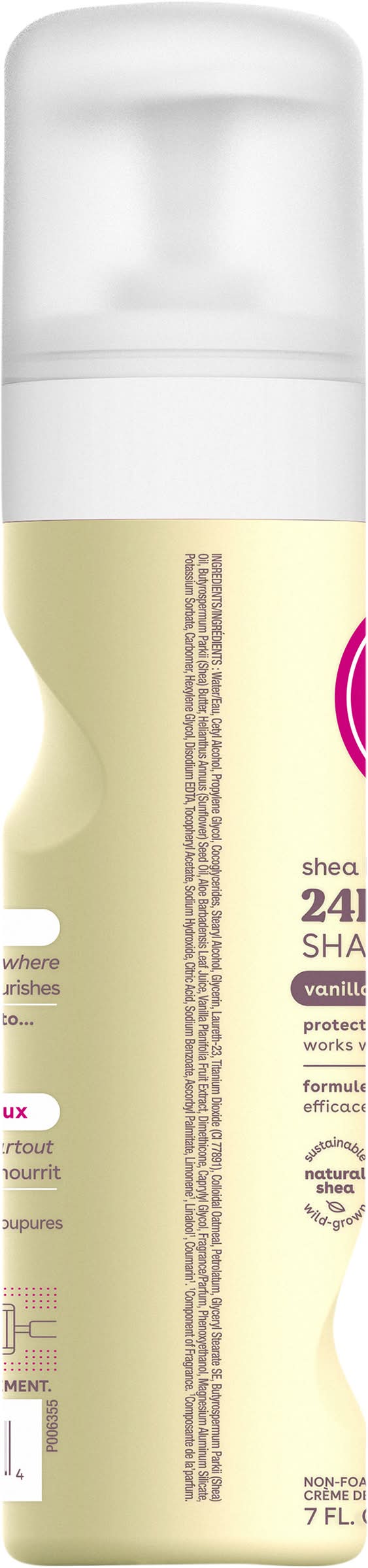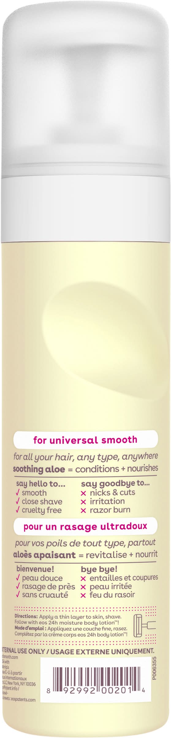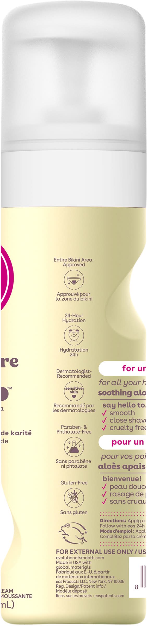 24h moisture. Protective shea butter formula works wet + dry. For Universal Smooth: For all your hair, any type, anywhere. Soothing aloe = conditions + nourishes. Say hello to: smooth, comfort, close shave. Say goodbye to: nicks & cuts; irritation; razor burn. Entire bikini area-approved. 24-hour hydration. Derma-tested & hypoallergenic. Paraben & phthalate-free. Cruelty-free. Sustainable natural shea wild grown.