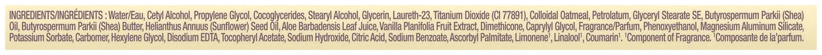 Ingredients: Water/Eau, Cetyl Alcohol, Propylene Glycol, Cocoglycerides, Stearyl Alcohol, Glycerin, Laureth-23, Titanium Dioxide (CI 77891), Colloidal Oatmeal, Petrolatum, Glyceryl Stearate SE, Butyrospermum Parkii (Shea) Oil, Butyrospermum Parkii (Shea) Butter, Helianthus Annuus (Sunflower) Seed Oil, Aloe Barbadensis Leaf Juice, Vanilla Planifolia Fruit Extract, Dimethicone, Caprylyl Glycol, Fragrance/Parfum, Phenoxyethanol, Magnesium Aluminum Silicate, Potassium Sorbate, Carbomer, Hexylene Glycol, Disodium EDTA, Tocopheryl Acetate, Sodium Hydroxide, Citric Acid, Sodium Benzoate, Ascorbyl Palmitate, Limonene(1), Linalool(1), Coumarin(1). (1) Component of Fragrance Contains: Oat