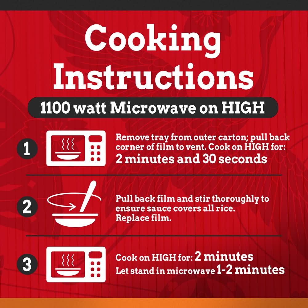 Directions for use: For food safety and best quality, follow these cooking instructions: Keep frozen until ready to use. Cook thoroughly before eating. Adjustment to cooking times may be required due to variations in all microwave ovens. Use caution as product and packaging will be hot. Do not reuse tray. Do not prepare in conventional or toaster oven. Check that product is cooked thoroughly. Internal temperature needs to reach 165 degrees F as measured by a food thermometer. Cook thoroughly. Cooking Instructions (1100 watt microwave on high): Remove tray from outer carton; pull back corner of film to vent. Cook on high for 2 minutes and 30 seconds. Pull back film and stir thoroughly to ensure sauce covers all rice. Replace film. Cook on high for 2 minutes. Let stand in microwave 1-2 minutes. When removing from microwave, hold onto the tray's side handles. Remove film. Stir and enjoy! Keep frozen. Important: Keep frozen, do not refreeze. Storage recommendation: Keep frozen. Important: Keep frozen, do not refreeze.