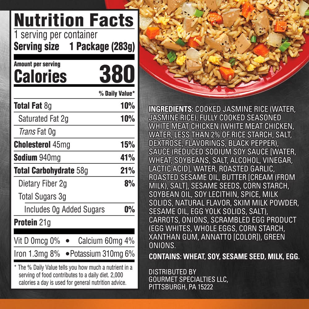 Ingredients: COOKED JASMINE RICE (WATER, JASMINE RICE), FULLY COOKED SEASONED WHITE MEAT CHICKEN (WHITE MEAT CHICKEN, WATER, LESS THAN 2% OF RICE STARCH, SALT, DEXTROSE, FLAVORINGS, BLACK PEPPER), SAUCE, REDUCED SODIUM SOY SAUCE [WATER, WHEAT, SOYBEANS, SALT, ALCOHOL, VINEGAR, LACTIC ACID], WATER, ROASTED GARLIC, ROASTED SESAME OIL, BUTTER [CREAM (FROM MILK), SALT], SESAME SEEDS, CORN STARCH, SOYBEAN OIL, SOY LECITHIN, SPICE, MILK SOLIDS, NATURAL FLAVOR, SKIM MILK POWDER, SESAME OIL, EGG YOLK SOLIDS, SALT, CARROTS, ONIONS, SCRAMBLED EGG PRODUCT (EGG WHITES, WHOLE EGGS, CORN STARCH, XANTHAN GUM, ANNATTO [COLOR]), GREEN ONIONS. Contains: CONTAINS: WHEAT, SOY, SESAME SEED, MILK, EGG.