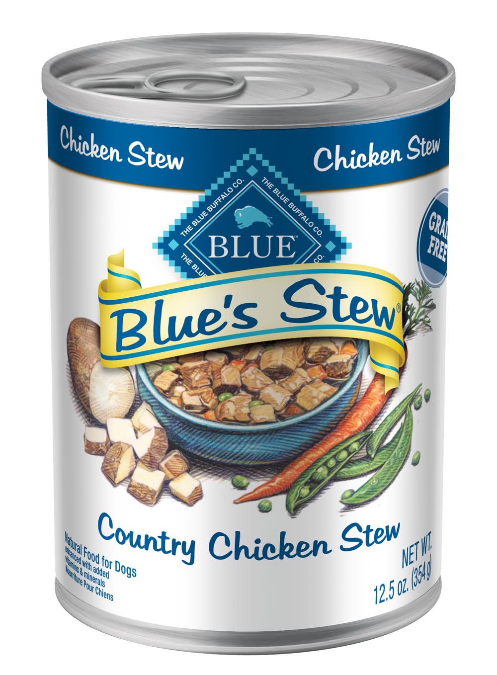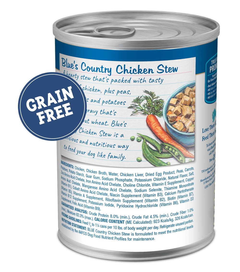 Natural food for dogs enhanced with added vitamins & minerals. No artificial flavors or preservatives. No corn, wheat or soy. Grain free. Blue's Country Chicken Stew: A hearty stew that's packed with tasty chunks of chicken, plus peas, diced carrots and potatoes in a savory gravy that's made without wheat. Blue's Country Chicken Stew is a delicious and nutritious way to feed your dog like family. True Blue Promise: Always starts with protein-rich chicken. No chicken/poultry by-product meals. Love them like family. Feed them like family. Please recycle. • Blue Buffalo Company, Ltd., 11 River Road,Wilton,CT,06897 • Packaging: Reusable