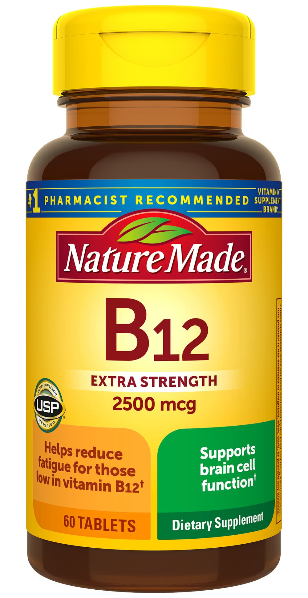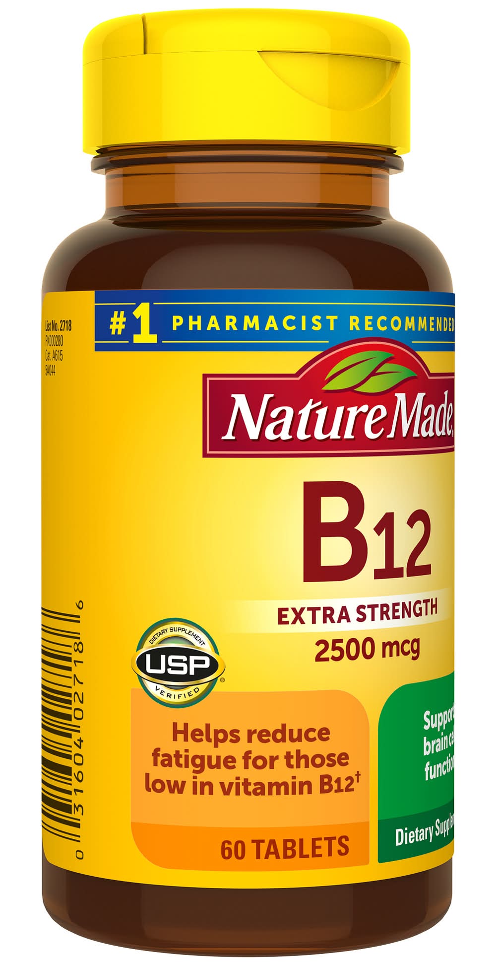 Nature Made Extra Strength Vitamin B12 2500 mcg Tablets help break down food into energy that your body can use all day long. Sourced from high quality ingredients, this gluten free B12 supplement is a dietary supplement that has no color added and no artificial flavors. This Nature Made B12 supplement helps support energy metabolism(1). Adults take one Nature Made Extra Strength 2500 mcg Vitamin B12 supplement daily with water and a meal. Nature Made supplements are quality you can trust. USP Nature made nutritional products, West Hills,CA,91309-9903,USA.