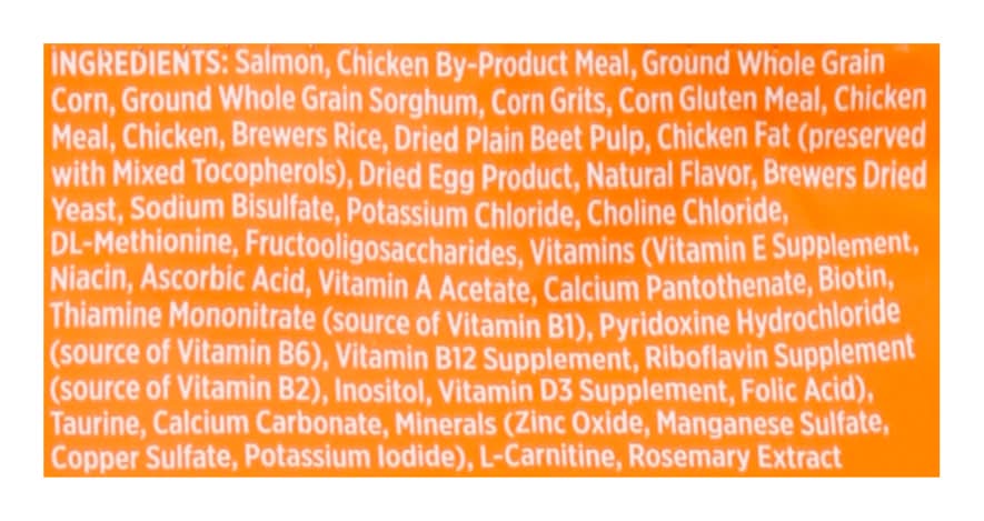 Ingredients: Salmon, Chicken By-Product Meal, Ground Whole Grain Corn, Ground Whole Grain Sorghum, Corn Grits, Corn Gluten Meal, Chicken Meal, Chicken, Brewers Rice, Dried Plain Beet Pulp, Chicken Fat (Preserved with Mixed Tocopherols), Dried Egg Product, Natural Flavor, Brewers Dried Yeast, Sodium Bisulfate, Potassium Chloride, Choline Chloride, Dl, -Methionine, Fructooligosaccharides, Vitamins (Vitamin E Supplement Niacin Ascorbic Acid Vitamin A Acetate Calcium Pantothenate Biotin Thiamine Mononitrate (Source of Vitamin 131), Pyridoxine Hydrochloride (Source of Vitamin B6), Vitamin B12 Supplements Riboflavin Supplement (Source of Vitamin B2), Inositol, Vitamin D3 Supplement, Folic Acid), Taurine, Calcium Carbonate, Minerals (Zinc Oxide Manganese Sulfate Copper Sulfate Potassium Iodide), 1-Carnitine, Rosemary Extract Contains: Fish, Salmon, Corn, Gluten, Eggs