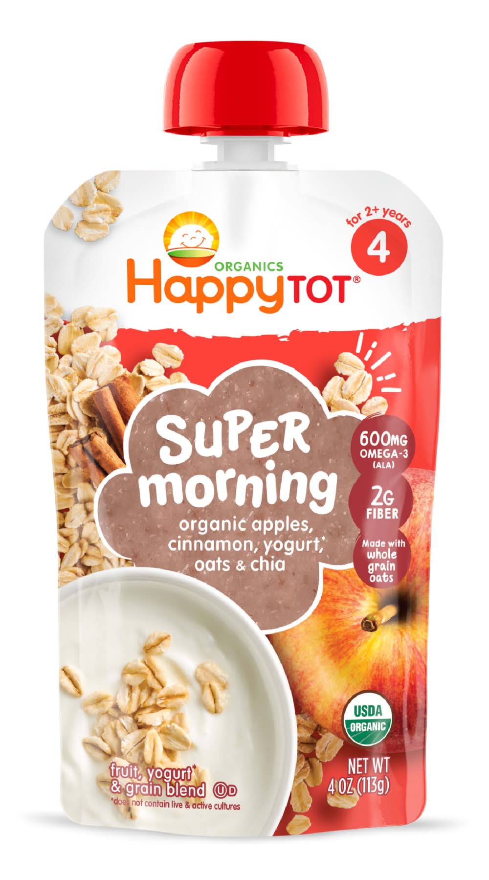Turn a good morning into a super morning, with Happy Tot Super Morning organic toddler pouches. Each pouch features a delicious breakfast blend, like organic apple, cinnamon, and whole milk yogurt*. These recipes also include whole grain oats and chia for added nutrients like omega-3s and fiber in your tot’s diet – a convenient and satisfying start to the day for your growing little one. *Does not contain live & active cultures Nurture, Inc., New York,NY,10038