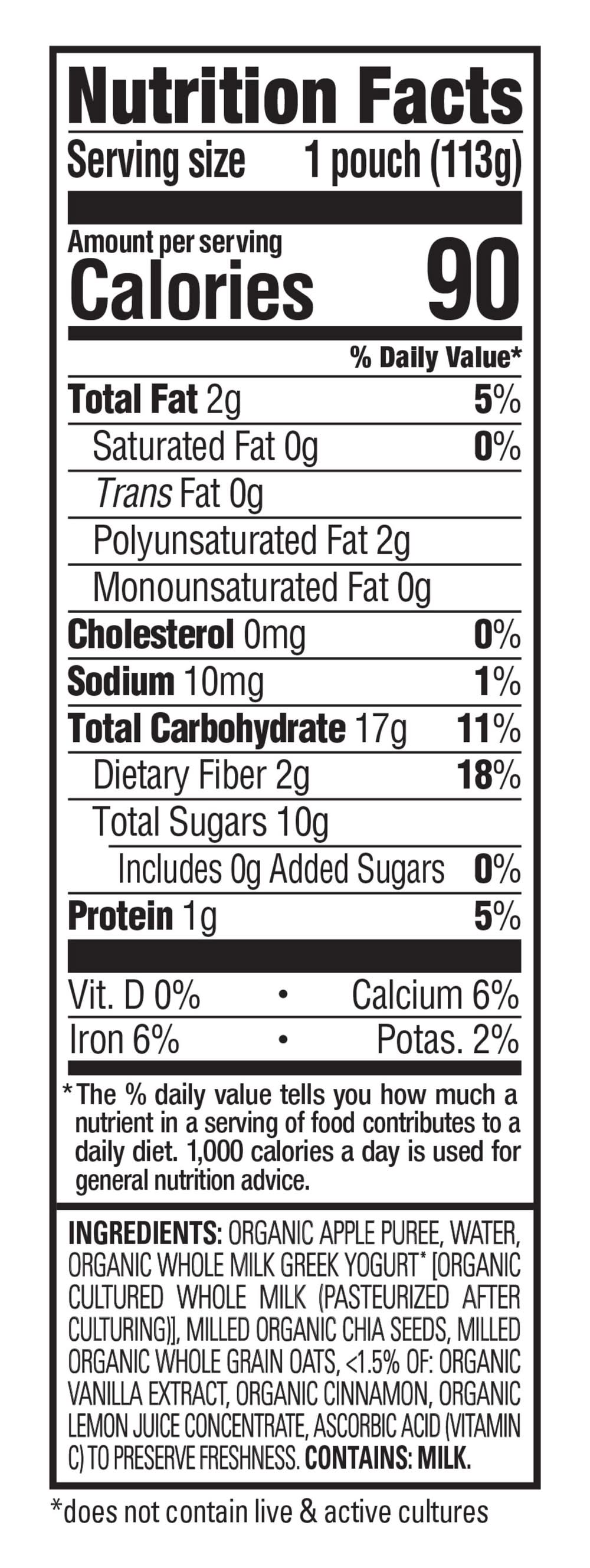Ingredients: ORGANIC APPLE PUREE, WATER, ORGANIC WHOLE MILK GREEK YOGURT [ORGANIC CULTURED WHOLE MILK (PASTEURIZED AFTER CULTURING)], MILLED ORGANIC CHIA SEEDS, MILLED ORGANIC WHOLE GRAIN OATS, 1.5% OF: ORGANIC VANILLA EXTRACT, ORGANIC CINNAMON, ORGANIC LEMON JUICE CONCENTRATE, ASCORBIC ACID (VITAMIN C), TO PRESERVE FRESHNESS. Contains: CONTAINS: MILK.