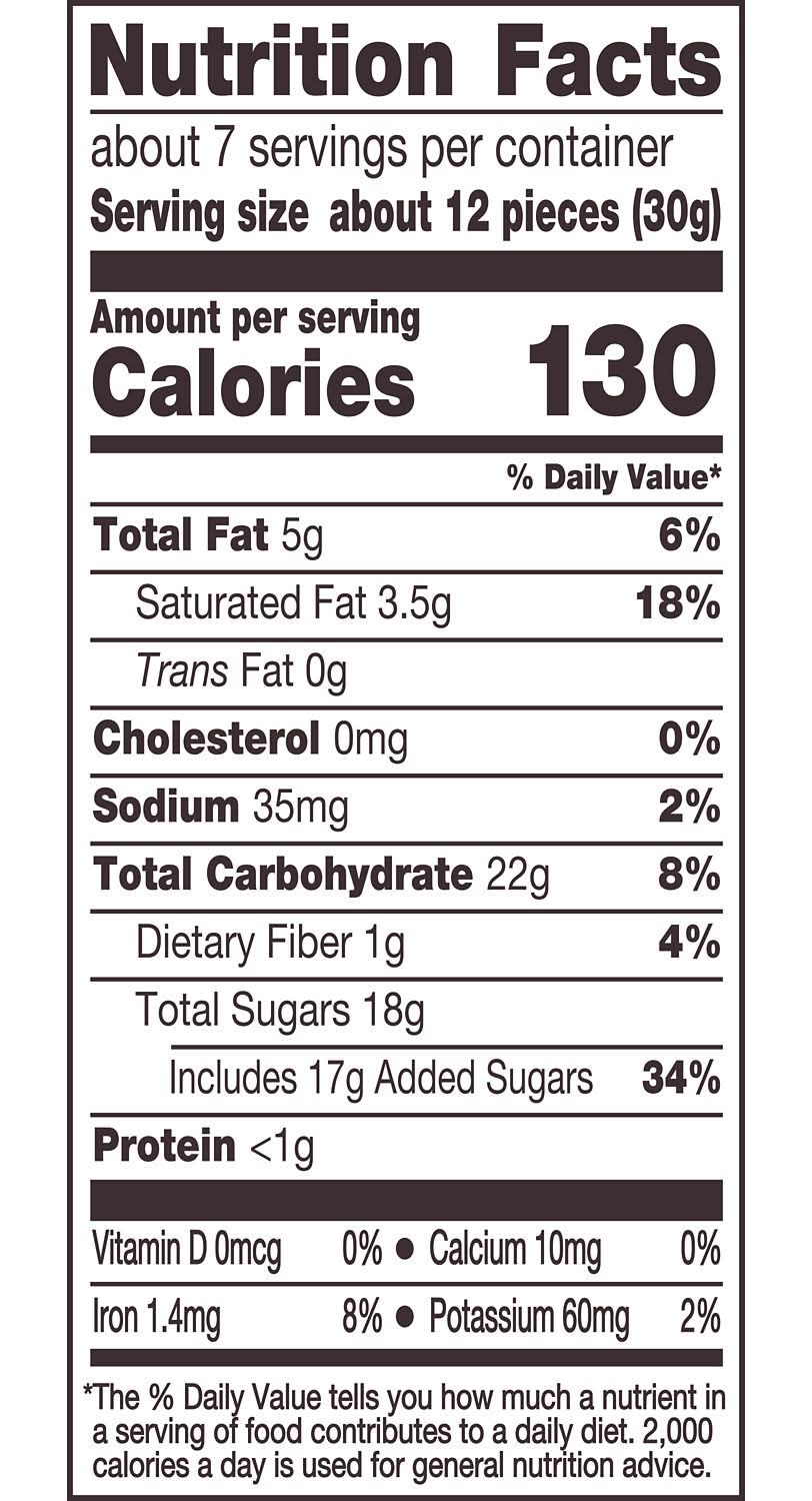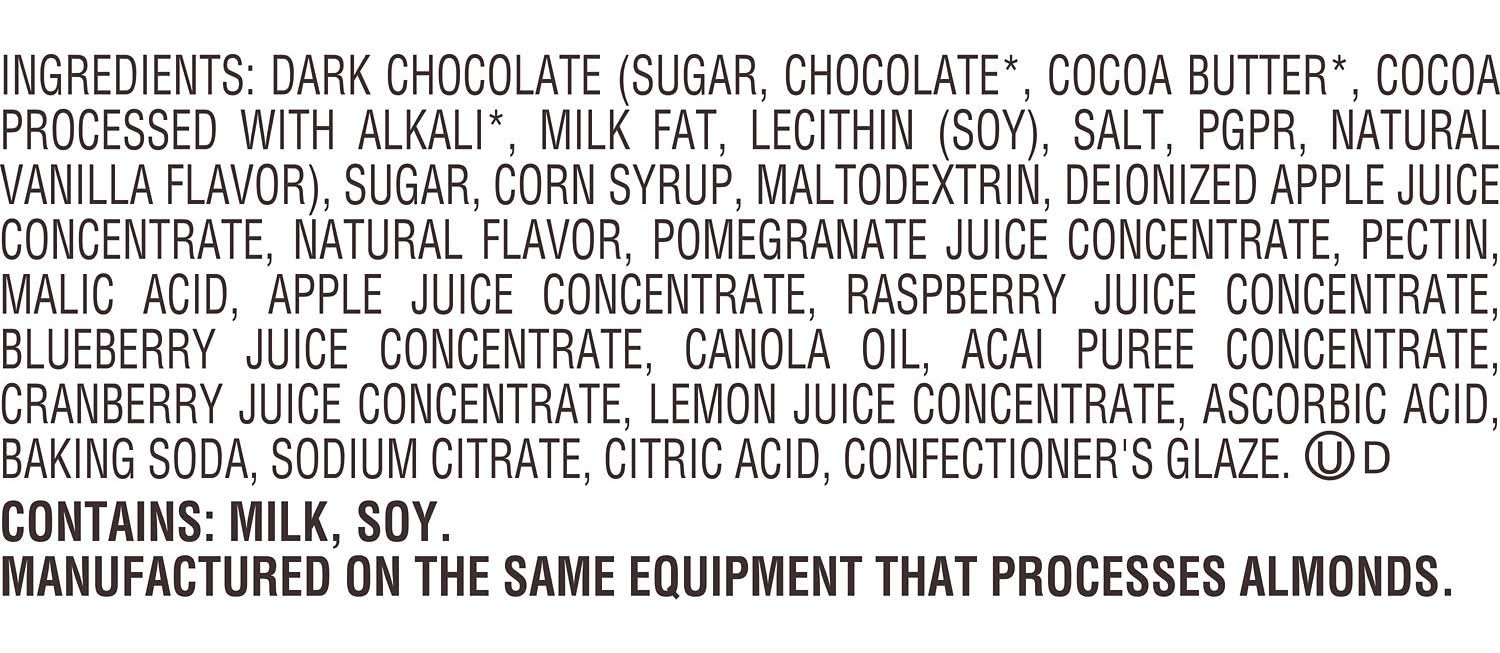 Ingredients: DARK CHOCOLATE (SUGAR, CHOCOLATE, COCOA BUTTER, COCOA PROCESSED WITH ALKALI, MILK FAT, LECITHIN (SOY), SALT, PGPR, NATURAL VANILLA FLAVOR), SUGAR, CORN SYRUP, MALTODEXTRIN, DEIONIZED APPLE JUICE CONCENTRATE, PECTIN, NATURAL FLAVOR, POMEGRANATE JUICE CONCENTRATE, APPLE JUICE CONCENTRATE, MALIC ACID, BLUEBERRY JUICE CONCENTRATE, CANOLA OIL, ACAI PUREE CONCENTRATE, CRANBERRY JUICE CONCENTRATE, LEMON JUICE CONCENTRATE, RASPBERRY JUICE CONCENTRATE, ASCORBIC ACID, BAKING SODA, SODIUM CITRATE, CITRIC ACID, CONFECTIONER'S GLAZE. Contains: Milk, Soybeans