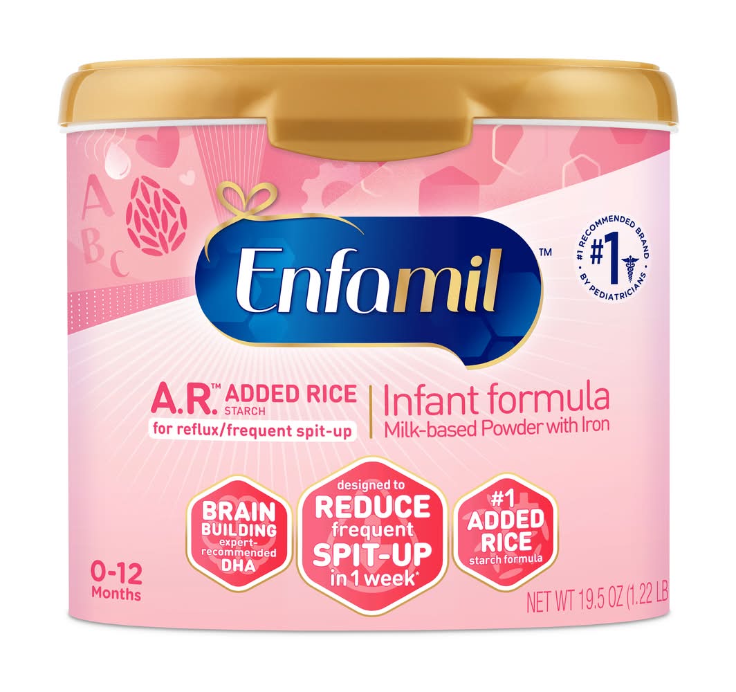 50% less spit-up in 1 week. the same infants at the beginning of the study; in infants who regurgitate frequently (5 or more spits-ups per day).Experts agree on the many benefits of breast milk. If you choose to use infant formula, ask your baby's doctor about Enfamil A.R.Enfamil A.R. is an innovative formula that has nutrients also found in breast milk and has been clinically proven to significantly reduce frequent spit-up within 1 week, while maintaining balanced nutrition, unlike adding rice cereal to routine formula.Proprietary Triple Health Guard Nutrient Blend • Exclusive Natural Defense Dual Prebiotic blend • Omega-3 DHA • Complete nutrition, 30 nutrients, shown to foster healthy growth Immune Health • Prebiotics and vitamins C & E support immune health • Prebiotics are nutrients that promote the growth of beneficial bacteria that occur naturally in the digestive tract, where 70% of the immune system is located Brain Development • 20 mg Omega-3 DHA per 6 fl oz serving, the same as the worldwide average found in breast milk • Omega-3 DHA supports brain and eye development. In an independent study, Enfamil that has DHA at 0.32% of total fatty acids was shown to foster learning ability from infancy through age 5 Average level of DHA in worldwide breast milk is 0.32 +/- 0.22% (mean +/- standard deviation of total fatty acids) based on an analysis of 65 studies of 2474 women Facts to Feel Good About: • 20 mg Omega-3 DHA per 6 fluid ounces • No artificial flavors, sweeteners or colors