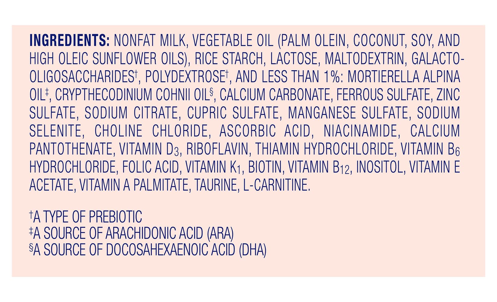 Ingredients: NONFAT MILK, VEGETABLE OIL (PALM OLEIN, COCONUT, SOY, AND HIGH OLEIC SUNFLOWER OILS), RICE STARCH, LACTOSE, MALTODEXTRIN, GALACTOOLIGOSACCHARIDES†, POLYDEXTROSE†, AND LESS THAN 1%: MORTIERELLA ALPINA OIL†, CRYPTHECODINIUM COHNII OIL§, CALCIUM CARBONATE, FERROUS SULFATE, ZINC SULFATE, SODIUM CITRATE, CUPRIC SULFATE, MANGANESE SULFATE, SODIUM SELENITE, CHOLINE CHLORIDE, ASCORBIC ACID, NIACINAMIDE, CALCIUM PANTOTHENATE, VITAMIN D3, RIBOFLAVIN, THIAMIN HYDROCHLORIDE, VITAMIN B6 HYDROCHLORIDE, FOLIC ACID, VITAMIN K1, BIOTIN, VITAMIN B12, INOSITOL, VITAMIN E ACETATE, VITAMIN A PALMITATE, TAURINE, L-CARNITINE. †A TYPE OF PREBIOTIC †A SOURCE OF ARACHIDONIC ACID (ARA) §A SOURCE OF DOCOSAHEXAENOIC ACID (DHA) Contains: Milk, TreeNuts, Soybeans, Lactose