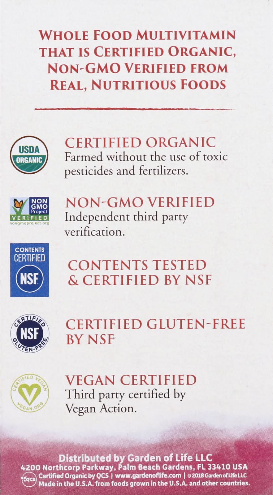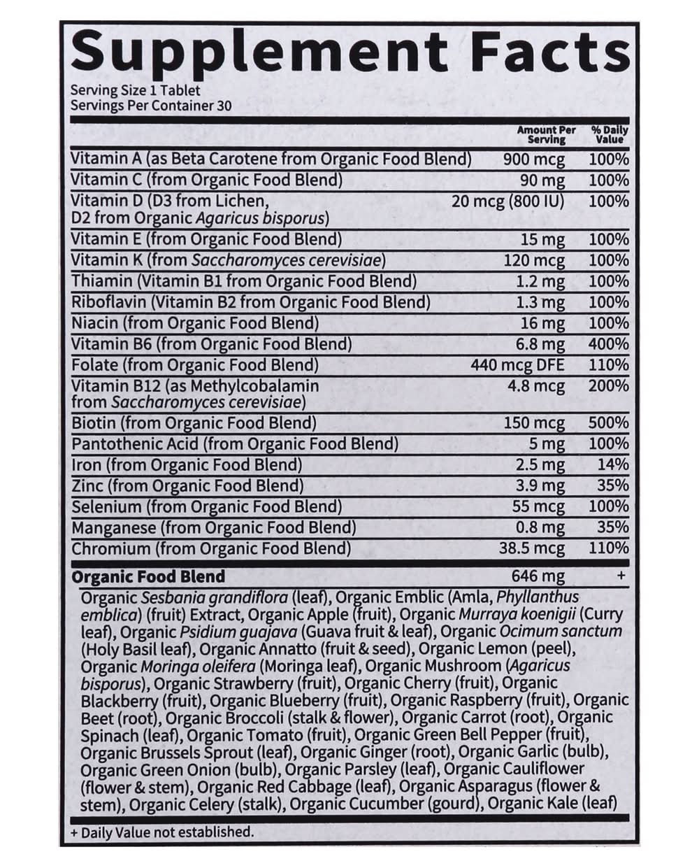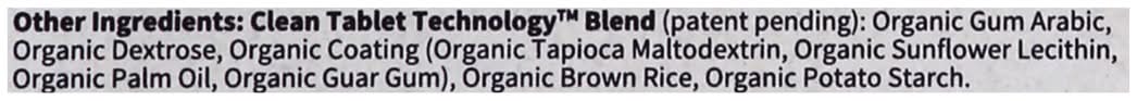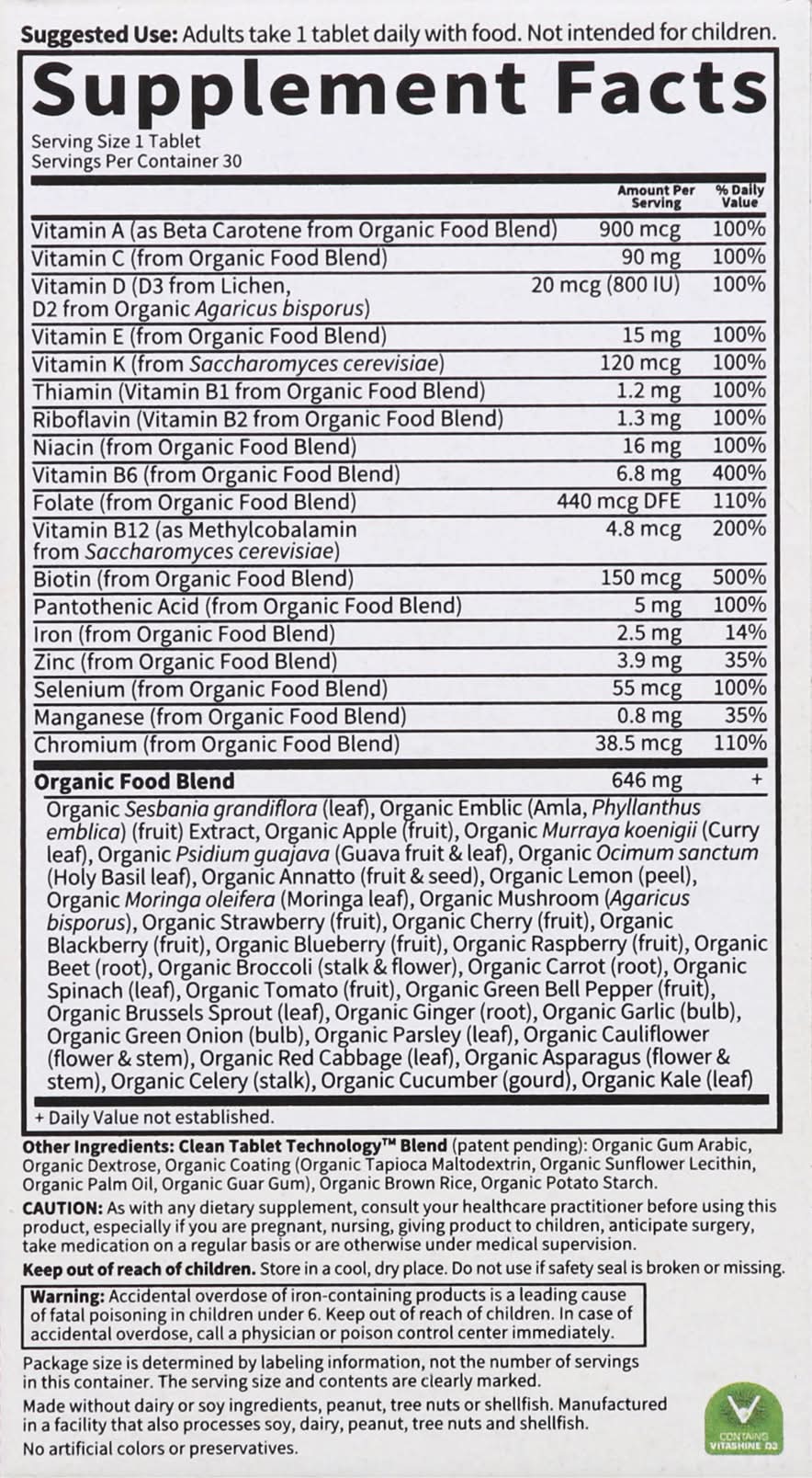 Ingredients: Organic Food Blend: Organic Sesbania Grandiflora (Leaf), Organic Emblic (Amla, Phyllanthus Emblica) (Fruit) Extract, Organic Apple (Fruit), Organic Murraya Koenigii (Curry Leaf), Organic Psidium Guajava (Guava Fruit & Leaf), Organic Ocimum Sanctum (Holy Basil Leaf), Organic Annatto (Fruit & Seed), Organic Lemon (Peel), Organic Moringa Oleifera (Moringa Leaf), Organic Mushroom (Agaricus Bisporus), Organic Strawberry (Fruit), Organic Cherry (Fruit), Organic Blackberry (Fruit), Organic Blueberry (Fruit), Organic Raspberry (Fruit), Organic Beet (Root), Organic Broccoli (Stalk & Flower), Organic Carrot (Root), Organic Spinach (Leaf), Organic Tomato (Fruit), Organic Green Bell Pepper (Fruit), Organic Brussels Sprout (Leaf), Organic Ginger (Root), Organic Garlic (Bulb), Organic Green Onion (Bulb), Organic Parsley (Leaf), Organic Cauliflower (Flower & Stem), Organic Red Cabbage (Leaf), Organic Asparagus (Flower & Stem), Organic Celery (Stalk), Organic Cucumber (Gourd), Organic Kale (Leaf). Other Ingredients: Clean Tablet Technology Blend (Patent Pending): Organic Gum Arabic, Organic Dextrose, Organic Coating (Organic Tapioca Maltodextrin, Organic Sunflower Lecithin, Organic Palm Oil, Organic Guar Gum), Organic Brown Rice, Organic Potato Starch Contains: Soybeans, Milk, Peanuts, Tree Nuts, Crustacean Shellfish
