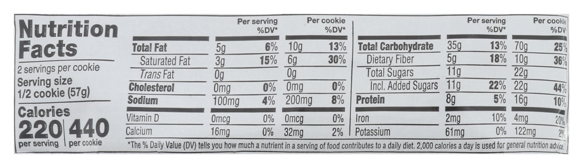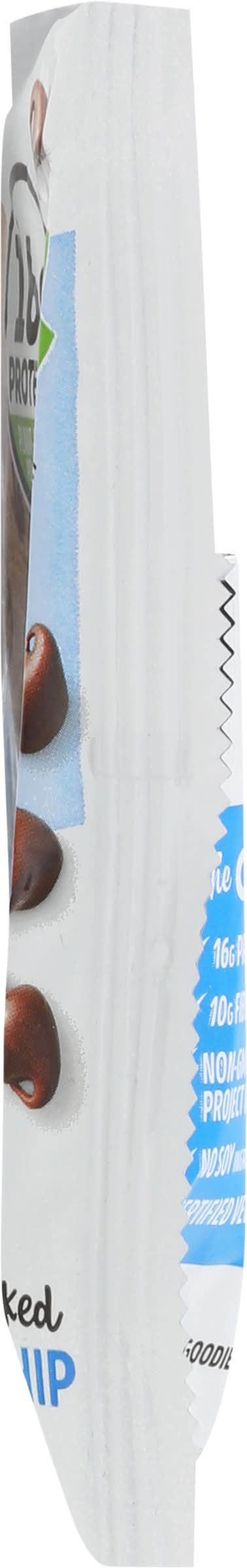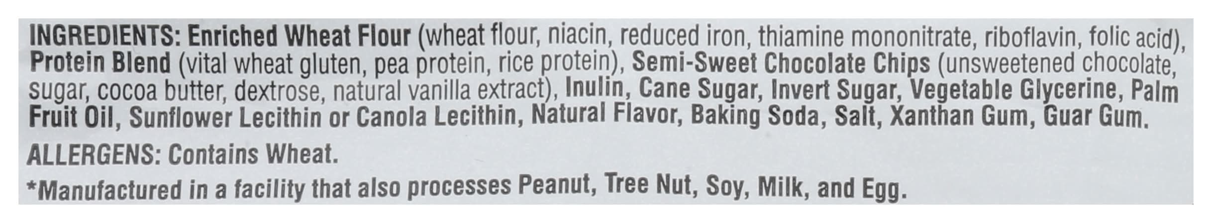 Ingredients: Enriched Wheat Flour (Wheat Flour, Niacin, Reduced Iron, Thiamine Mononitrate, Riboflavin, Folic Acid), Protein Blend (Vital Wheat Gluten, Pea Protein, Rice Protein), Semi-Sweet Chocolate Chips (Unsweetened Chocolate, Sugar, Cocoa Butter, Dextrose, Natural Vanilla Extract), Inulin, Cane Sugar, Invert Sugar, Vegetable Glycerine, Palm Fruit Oil, Sunflower Lecithin, Natural Flavor, Baking Soda, Salt, Xanthan Gum, Guar Gum Contains: Wheat, Gluten, Peanuts, Tree Nuts, Soybeans, Milk, Eggs