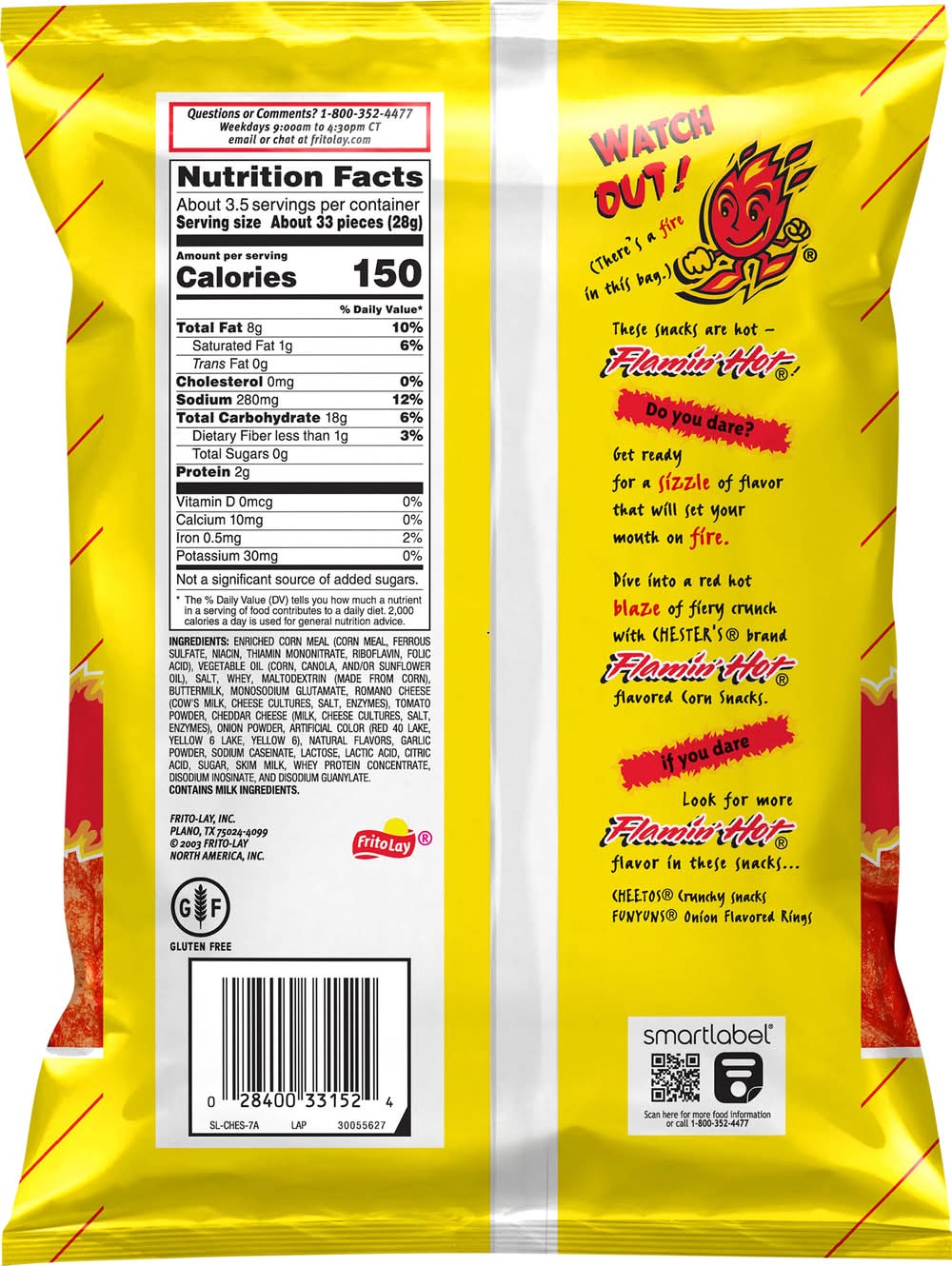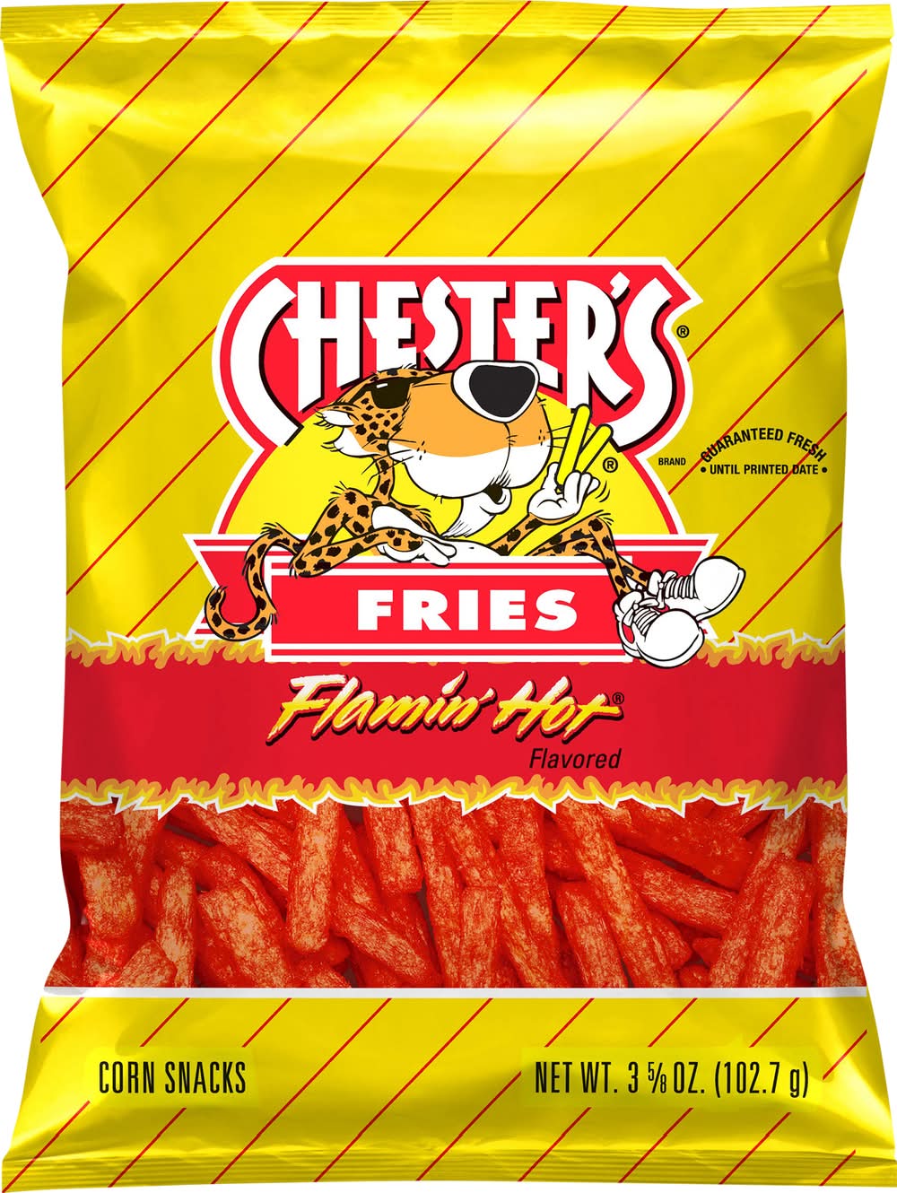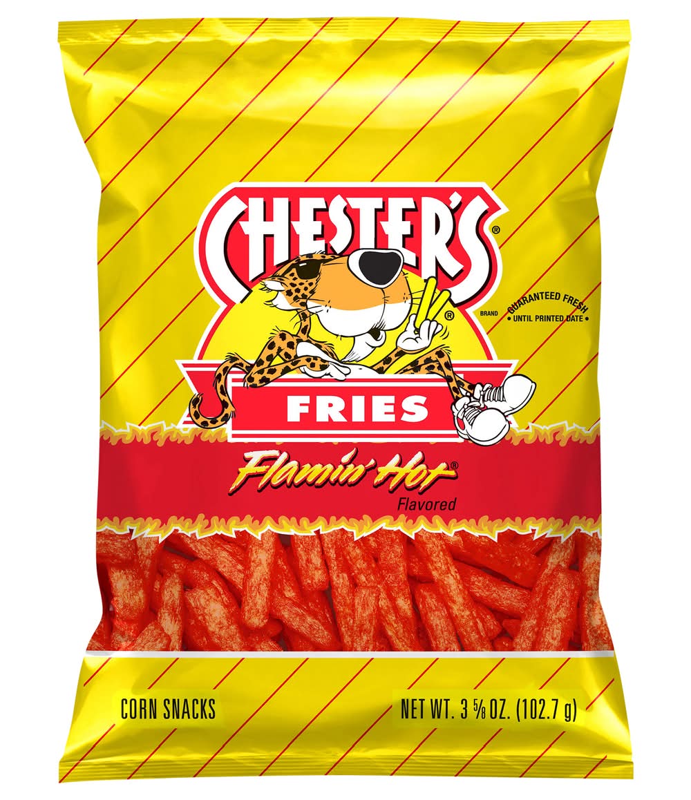 When Chester Cheetah puts his name on a snack, you can count on a bold and cheesy flavor like you've never tasted. CHESTER'S snacks are made with a special blend of real cheese seasoning to give each bite the perfect pop and zing. Includes 1 (3.125 oz) bag of Chester's Flamin' Hot Fries. Made in USA • Flavor: Flamin' hot • Frito-Lay, Inc., 7701 Legacy Drive, Plano, Texas.
