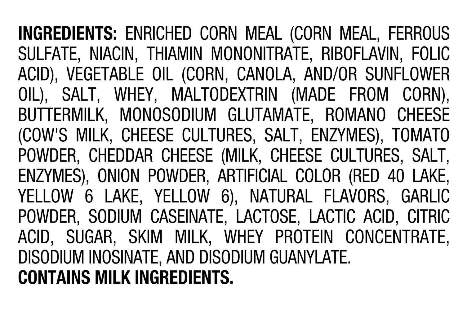 Ingredients: Enriched Corn Meal (Corn Meal, Ferrous Sulfate, Niacin, Thiamin Mononitrate, Riboflavin, Folic Acid), Vegetable Oil (Corn, Canola, and/or Sunflower Oil), Salt, Whey, Maltodextrin (Made from Corn), Buttermilk, Monosodium Glutamate, Romano Cheese (Cow's Milk, Cheese Cultures, Salt, Enzymes), Tomato Powder, Cheddar Cheese (Milk, Cheese Cultures, Salt, Enzymes), Onion Powder, Artificial Color (Red 40 Lake, Yellow 6 Lake, Yellow 6), Natural Flavors, Garlic Powder, Sodium Caseinate, Lactose, Lactic Acid, Citric Acid, Sugar, Skim Milk, Whey Protein Concentrate, Disodium Inosinate, and Disodium Guanylate Contains: Milk, Corn, Lactose