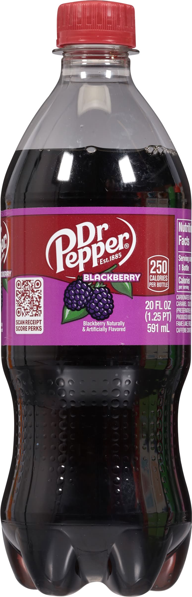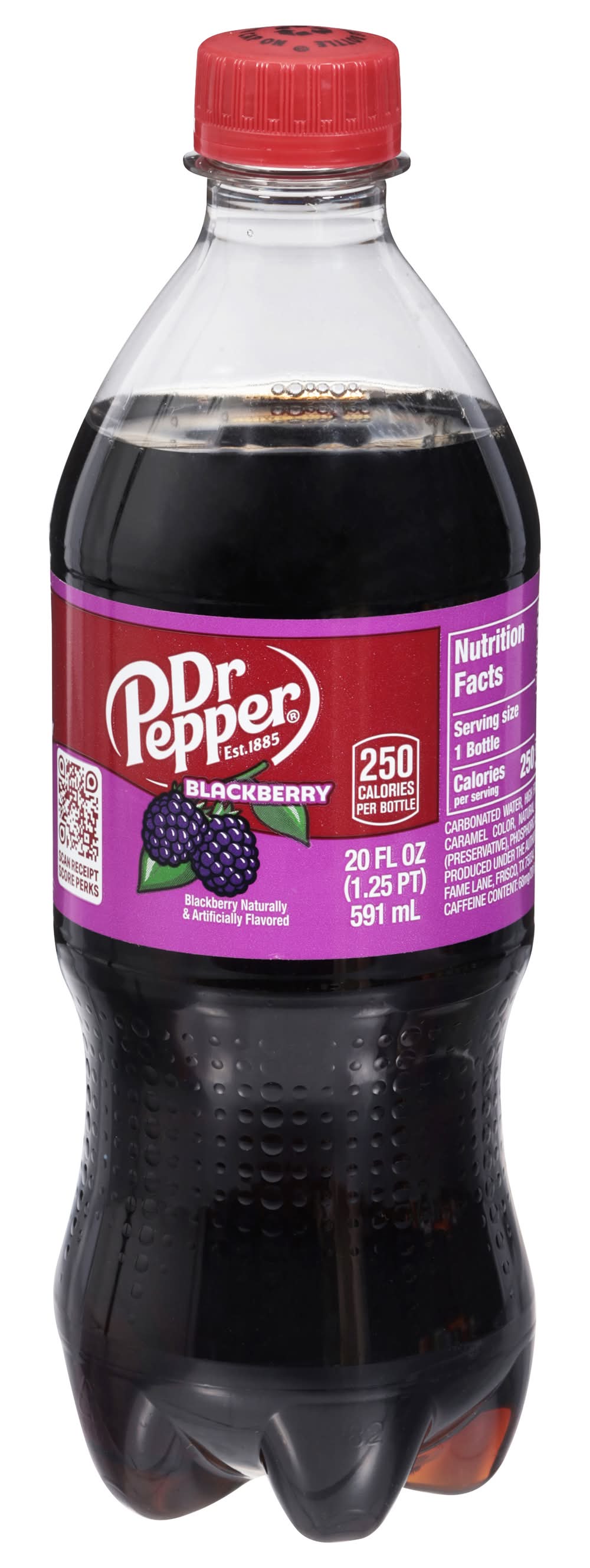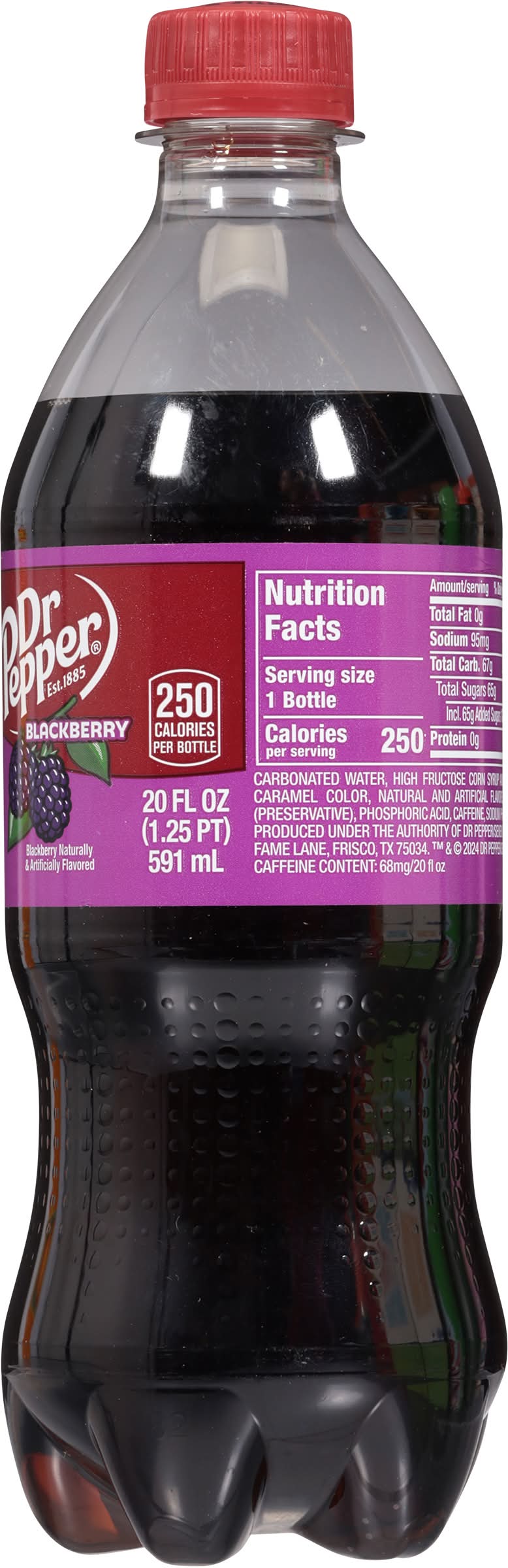 Blackberry naturally & artificially flavored. 250 calories per bottle. Caffeine Content: 68 mg/ 20 fl oz. drpepper.com. 1-888-377-3773. Please recycle. • Flavor: Blackberry • Packaging: Reusable