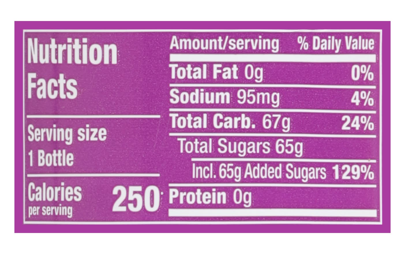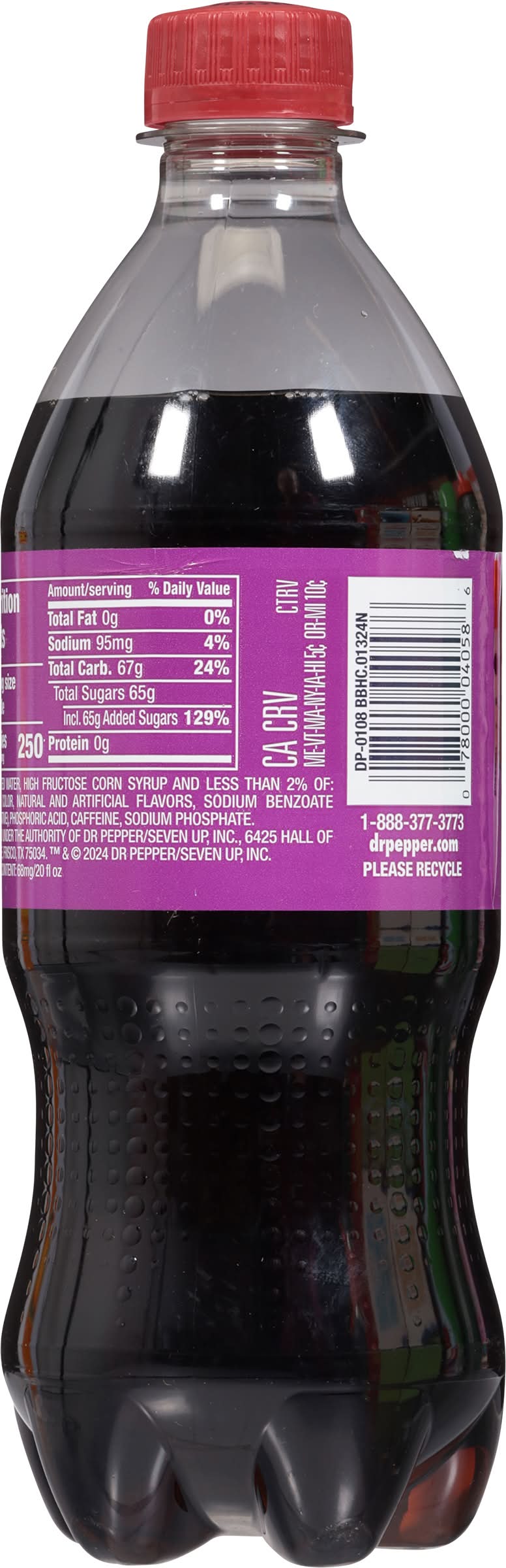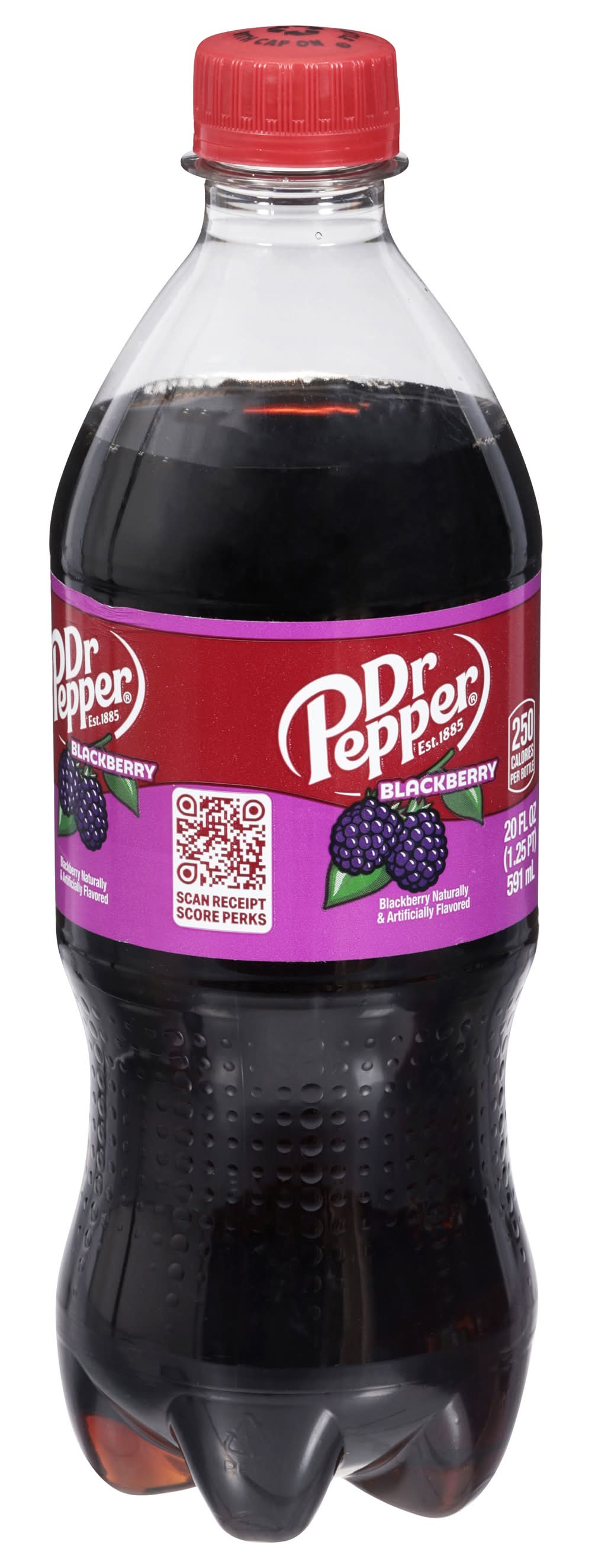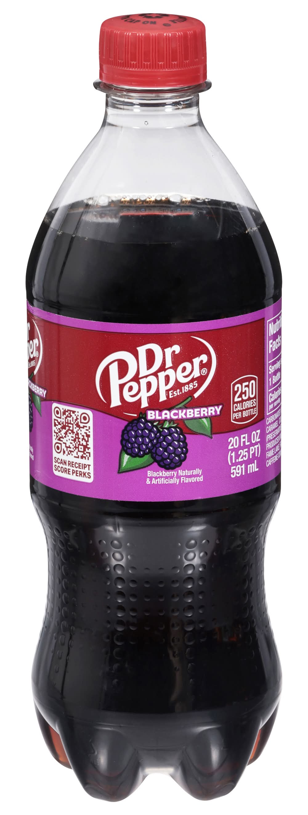 Blackberry naturally & artificially flavored. 250 calories per bottle. Caffeine Content: 68 mg/ 20 fl oz. drpepper.com. 1-888-377-3773. Please recycle. • Flavor: Blackberry • Packaging: Reusable