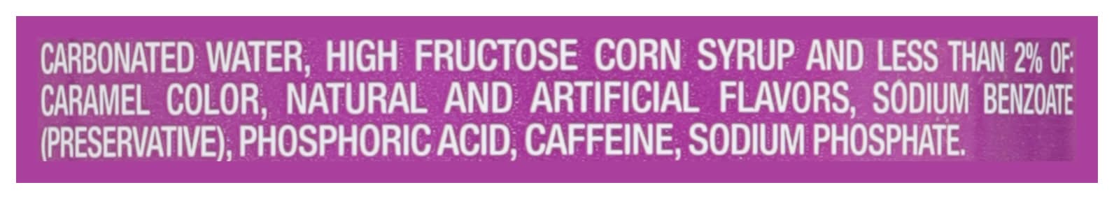 Ingredients: Carbonated Water, High Fructose Corn Syrup, Less than 2% of: Caramel Color, Natural and Artificial Flavors, Sodium Benzoate (Preservative), Phosphoric Acid, Caffeine, Sodium Phosphate Contains: Corn (Maize)