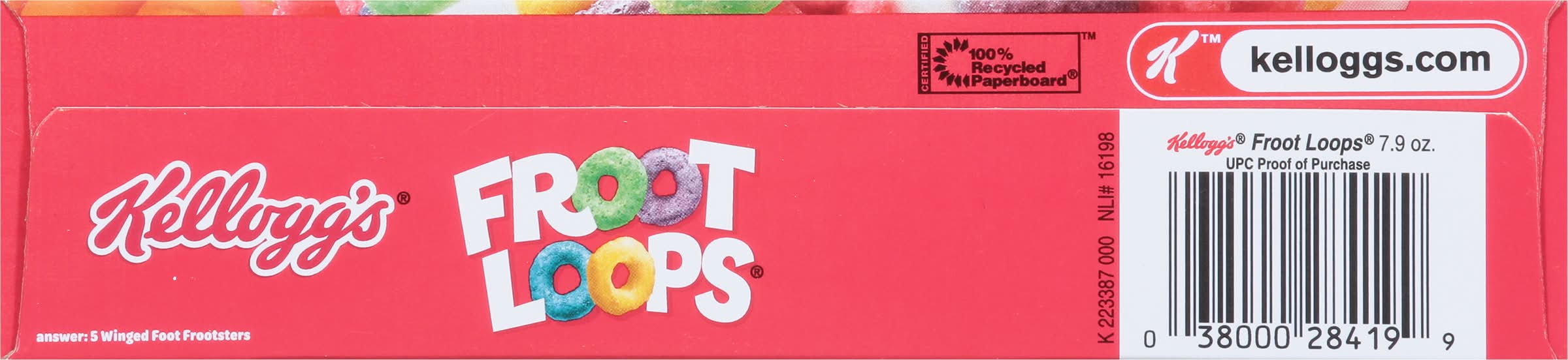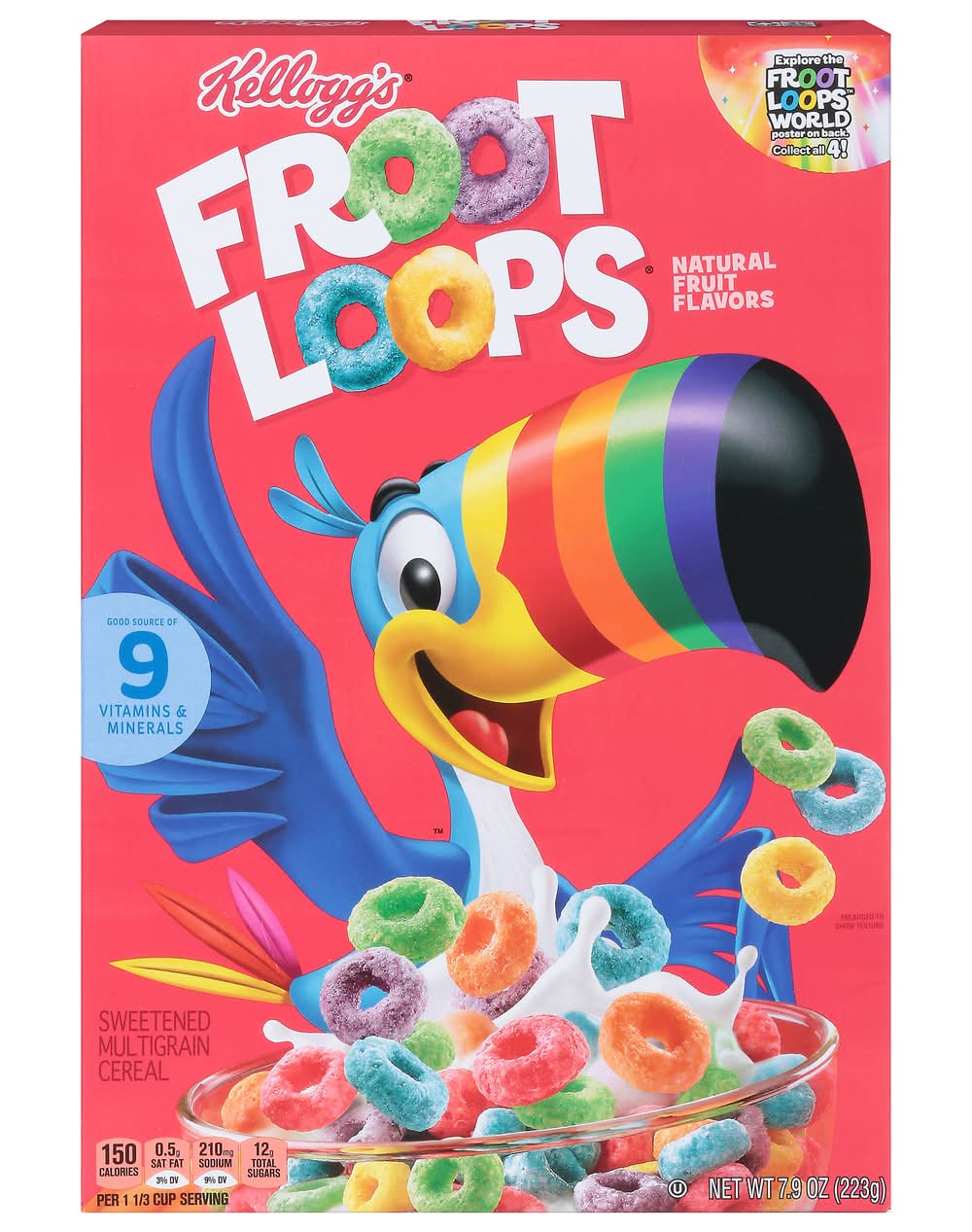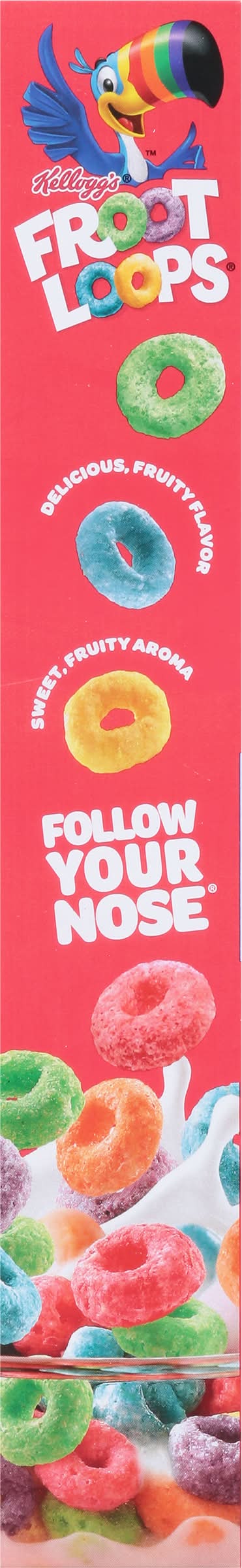 Follow your nose to delicious bursts of fruity flavor in Kellogg's Froot Loops sweetened multi-grain breakfast cereal. Froot Loops are vibrant, colorful crunchy O's made with tasty, natural fruit flavors and grains as the first ingredient. It's like a rainbow in every bowl. Fun to eat for adults and kids, this low-fat cereal is a good source of nine vitamins and minerals per serving. The entire family can enjoy a bowl with milk or a dairy alternative in the morning, afternoon or as a late-night