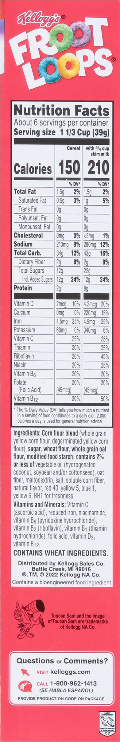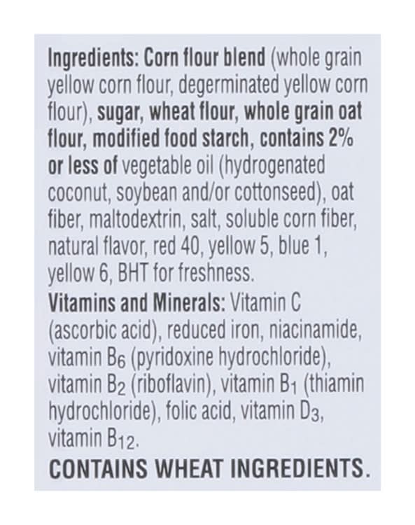 Ingredients: Corn Flour Blend (Whole Grain Yellow Corn Flour, Degerminated Yellow Corn Flour), Sugar, Wheat Flour, Whole Grain Oat Flour, Modified Food Starch, Contains 2% or Less of Vegetable Oil (Hydrogenated Coconut, Soybean and/or Cottonseed), Oat Fiber, Maltodextrin, Salt, Soluble Corn Fiber, Natural Flavor, Red 40, Yellow 5, Blue 1, Yellow 6, BHT for Freshness. Vitamins and Minerals: Vitamin C (Ascorbic Acid), Reduced Iron, Niacinamide, Vitamin B6 (Pyridoxine Hydrochloride), Vitamin B2 (Riboflavin), Vitamin B₁ (Thiamin Hydrochloride), Folic Acid, Vitamin D3, Vitamin B12 Contains: Wheat, Corn, Oat, Tree Nuts, Coconuts, Soybeans