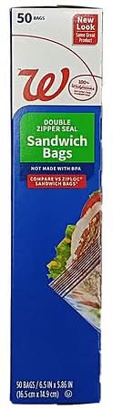 Walgreens double zipper seal sandwich bags. Made in THAILAND*Compare the regular retail price of Walgreens brand products to the regular retail price of similar national brand products. Size: 6.5 x 5.86 In