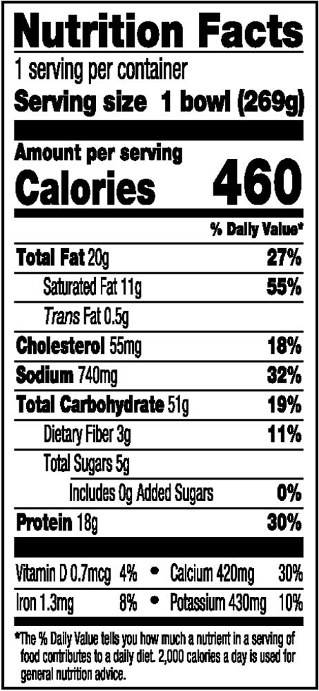 Directions for use: Microwave Oven: Make a 1-inch slit in overwrap. Cook on high 4-5 minutes. Let sit 1 minute. Serve. Conventional Oven: Preheat oven to 375 degrees F. Remove overwrap. Place bowl on a baking sheet. Bake for 35-40 minutes. Let sit 1 minute. Serve. Toaster Oven: Remove overwrap and bowl. Place in an oven-safe dish. Follow conventional oven directions. Directions: Ovens may vary. Perishable. Keep frozen. Storage recommendation: Perishable. Keep frozen.
