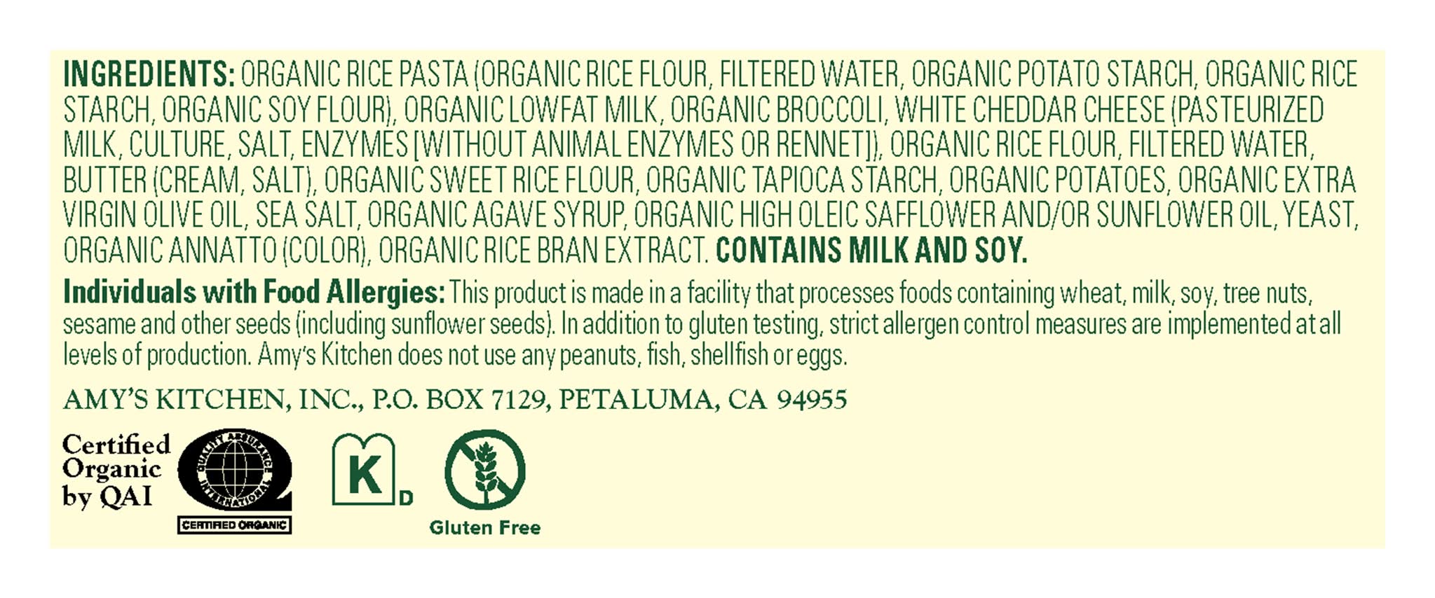 Made with organic vegetables. Gluten free. Certified Organic by QAI. No GMOs - No genetically engineered ingredients. From own home to yours. Some call it rotini, some call is fusilli, but once you’ve tasted this tender rice pasta in its creamy Cheddar sauce made with aged English cheddar, you’ll call it delicious. And with crisp organic broccoli florets and gluten free toasted bread crumbs added for flavor and crunch, you’ll find that this dish is one that will satisfy your whole family, At Amy’s, free gluten does not mean free from flavor. So enjoy Delicious meals made easy We love to cook for you. Family owned since 1987: Certified 100% recycled paperboard. Packaging: Reusable