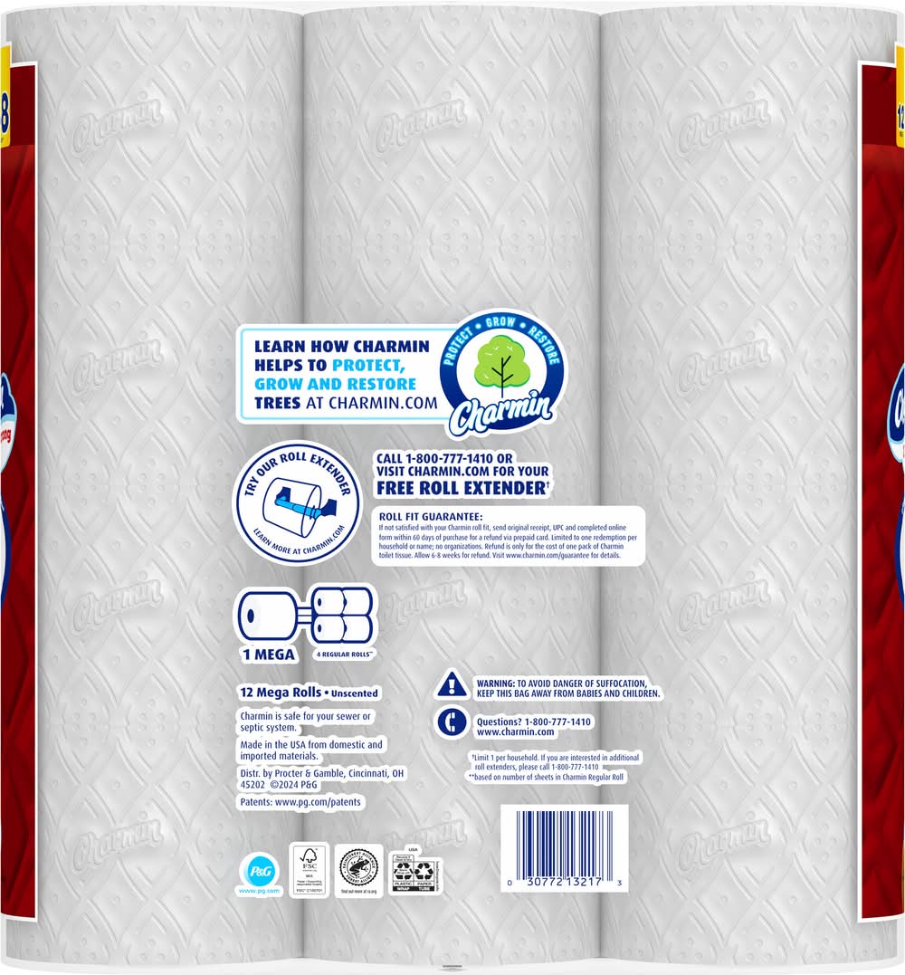 240 2-ply sheets per roll. Total 29 sq m (316 sq ft). 9.9 cm x 10.1 cm (3.92 in x 4 in). 12 mega = 48 regular (based on number of sheets in Charmin regular roll). Cleans better so you can use less (vs. USA leading 1-ply bargain brand). Try our roll extender. Free roll extender (limits 1 per household. If you are interested in additional roll extenders. 1 mega = 4 regular rolls (based on number of sheets in Charmin regular roll). Charmin is safe for your sewer or septic system. Cleans better (vs. USA leading 1-ply bargain brand). Roll fit Guarantee If not satisfied with Charmin roll fit, send original receipt, UPC and completed online form within 60 days of purchase for a refund via prepaid card. Limited to one redeem per house hold or name no organizations.