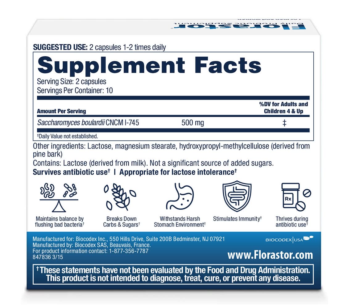 Florastor Dual Action Probiotic Supplement #1 selling probiotic worldwide** Helps flush out unwanted gut bacteria and boost the good* Helps protect against multiple GI issues* Supports immune health* Gluten-free, vegetarian, and non-GMO When your gut is imbalanced, it's hard to be at your best.* Unwanted bacteria bind to Florastor's unique probiotic strain, Saccharomyces boulardii CNCM I-745, and are then flushed away, allowing good bacteria to flourish.* The result? A more balanced and Biocodex Inc., 550 Hills Drive,Suite 200B,Bedminster,NJ,07921
