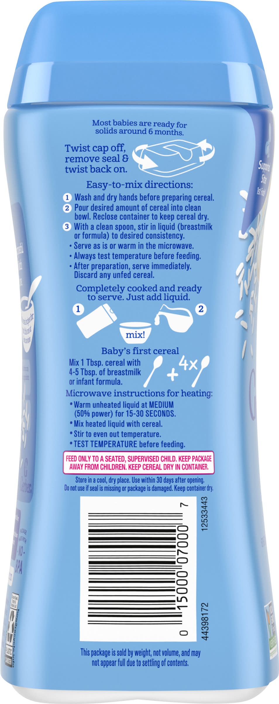 Start your baby's love of solid foods with single grain infant cereal. Single grain infant cereals are an ideal first solid food to check for food sensitivities, help develop baby's eating skills and provide iron for brain development and learning ability • Size: Stage 1 • Packaging: Reusable
