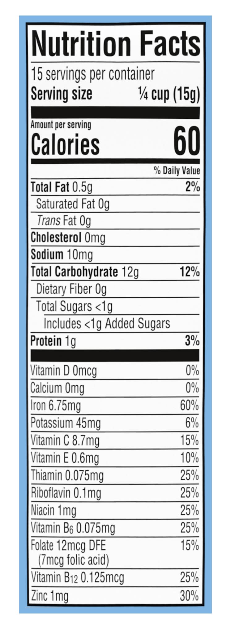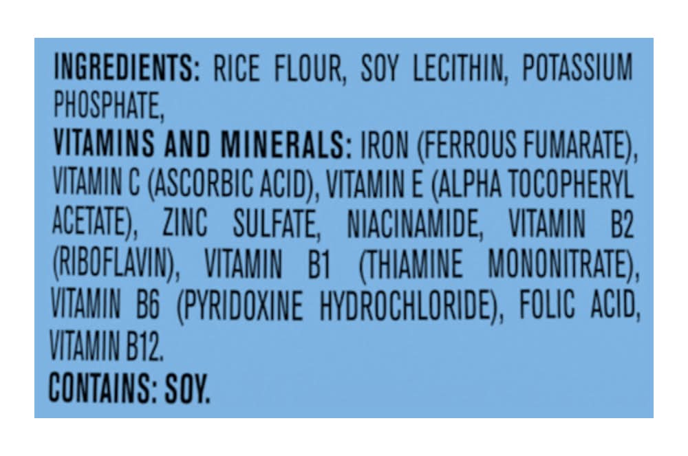 Ingredients: Rice Flour, Soy Lecithin, Potassium Phosphate. Vitamins and Minerals: Iron (Ferrous Fumarate), Vitamin C (Ascorbic Acid), Vitamin E (Alpha Tocopheryl Acetate), Zinc Sulfate, Niacinamide, Vitamin B2 (Riboflavin), Vitamin B1 (Thiamine Mononitrate), Vitamin B6 (Pyridoxine Hydrochloride), Folic Acid, Vitamin B12 Contains: Soybeans