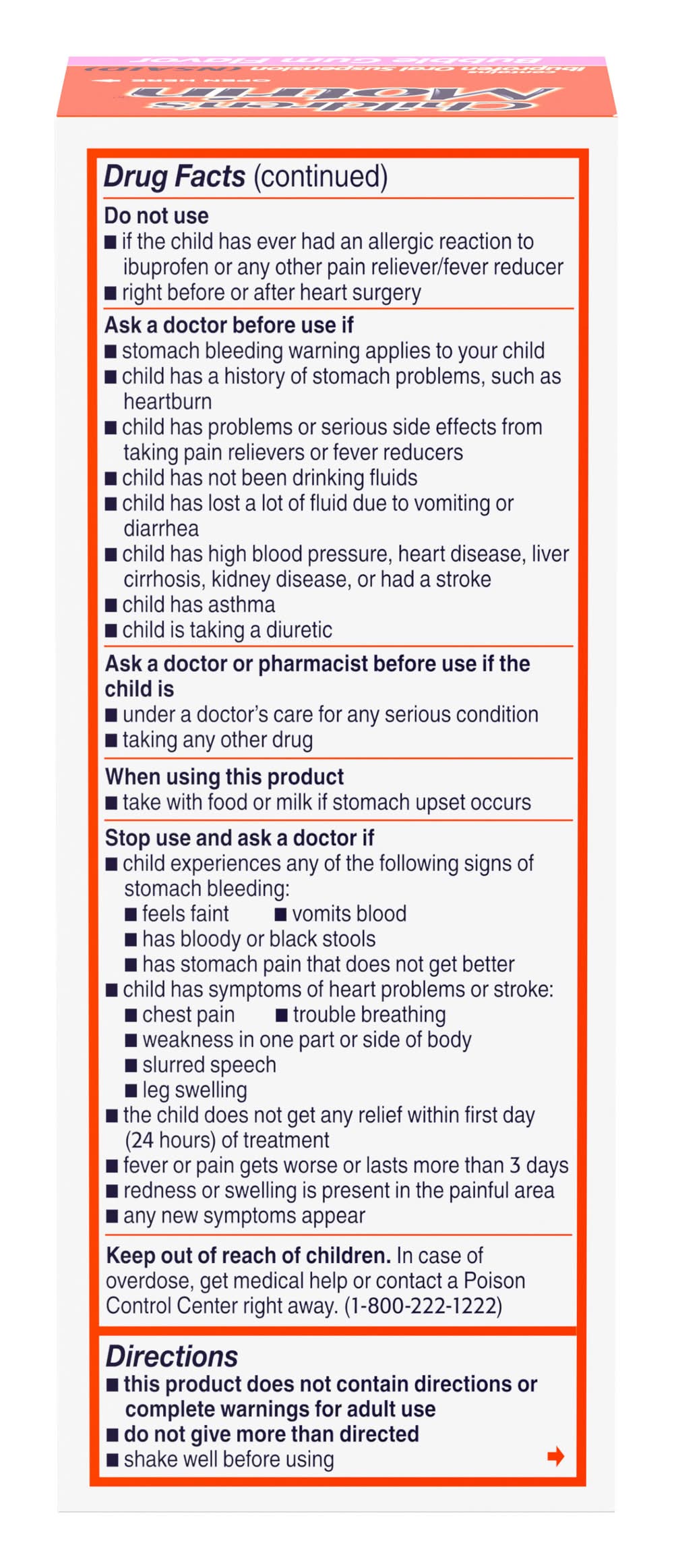 Ingredients: Active Ingredient (in each 5 mL = 1 teaspoonful) Ibuprofen 100 mg (NSAID)* (pain reliever/fever reducer) *nonsteroidal anti-inflammatory drug Inactive Ingredients Acesulfame potassium, anhydrous citric acid, FDC red no. 40, flavors, glycerin, polysorbate 80, pregelatinized starch, purified water, sodium benzoate, sucrose, xanthan gum
