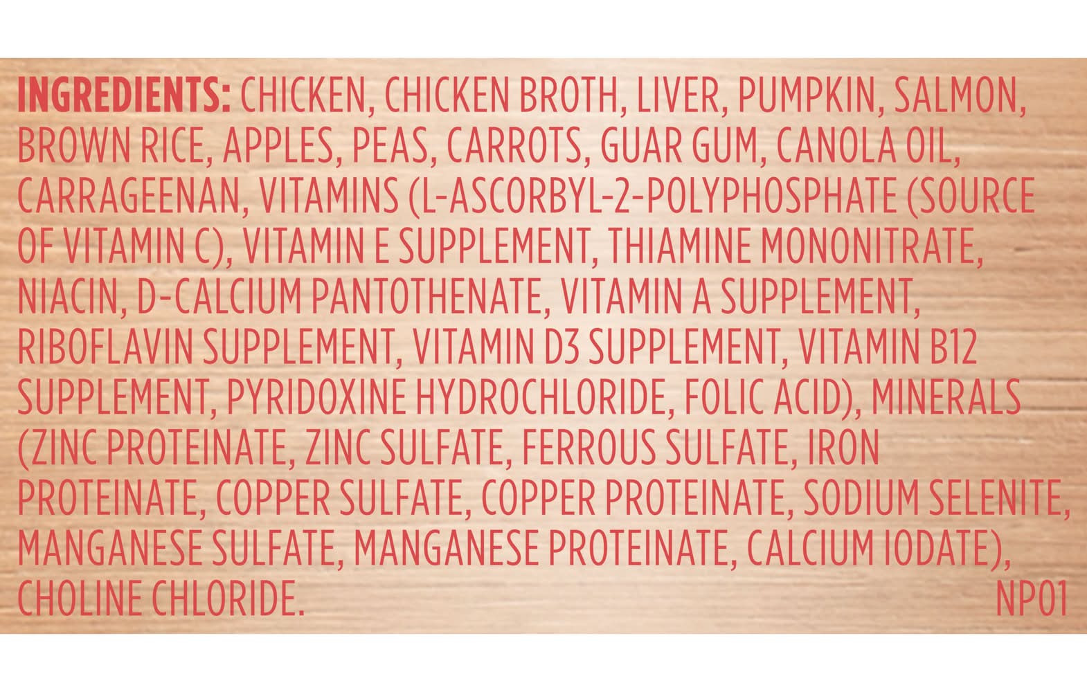 Ingredients: Chicken, Chicken Broth, Liver, Pumpkin, Salmon, Brown Rice, Apples, Peas, Carrots, Guar Gum, Canola Oil, Carrageenan, Vitamins (L-Ascorbyl-2-Polyphosphate (Source Of Vitamin C), Vitamin E Supplement, Thiamine Mononitrate, Niacin, D-Calcium Pantothenate, Vitamin A Supplement, Riboflavin Supplement, Vitamin D3 Supplement, Vitamin B12 Supplement, Pyridoxine Hydrochloride, Folic Acid), Minerals (Zinc Proteinate, Zinc Sulfate, Ferrous Sulfate, Iron Proteinate, Copper Sulfate, Copper Proteinate, Sodium Selenite, Manganese Sulfate, Manganese Proteinate, Calcium Iodate), Choline Chloride Contains: Fish, Salmon