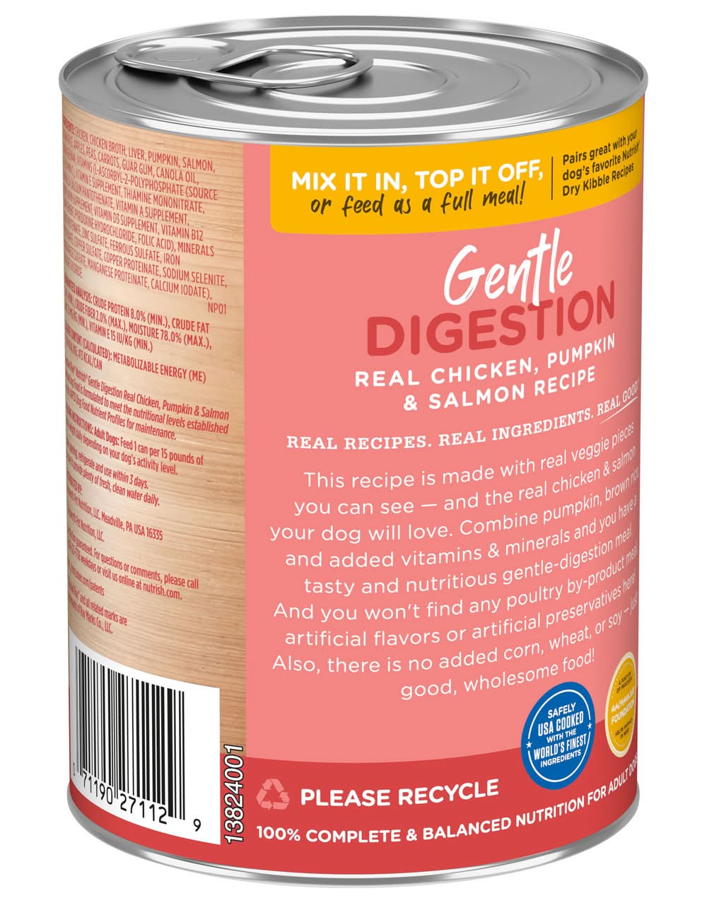 Help your dog feel their very best with Rachael Ray Nutrish Gentle Digestion Real Chicken, Pumpkin & Salmon Recipe wet dog food. This premium pate dog food is made with real chicken, real salmon and real veggies pieces you can see. Combined with pumpkin, brown rice and added vitamins and minerals, you get a tasty, complete and balanced meal for adult dogs that helps promote healthy digestion. It pairs great with your dog's favorite Nutrish dry kibble recipes. Mix it in, top it off or feed as a • Ainsworth Pet Nutrition, LLC, Meadville, PA, 16335 • Packaging: Reusable
