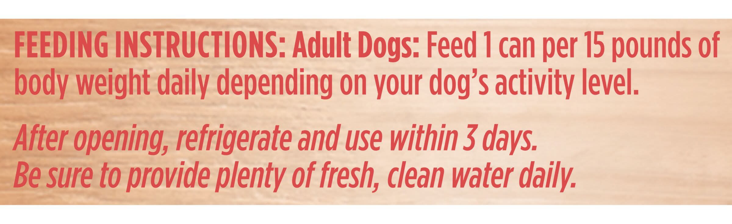Mix it in, top it off, or feed as a full meal! pairs great with your dog's favorite nutrish dry kibble recipes. feeding instructions: adult dogs: feed 1 can per 15 pounds of body weight daily depending on your dog's activity level. after opening, refrigerate and use within 3 days. be sure to provide plenty of fresh, clean water daily.